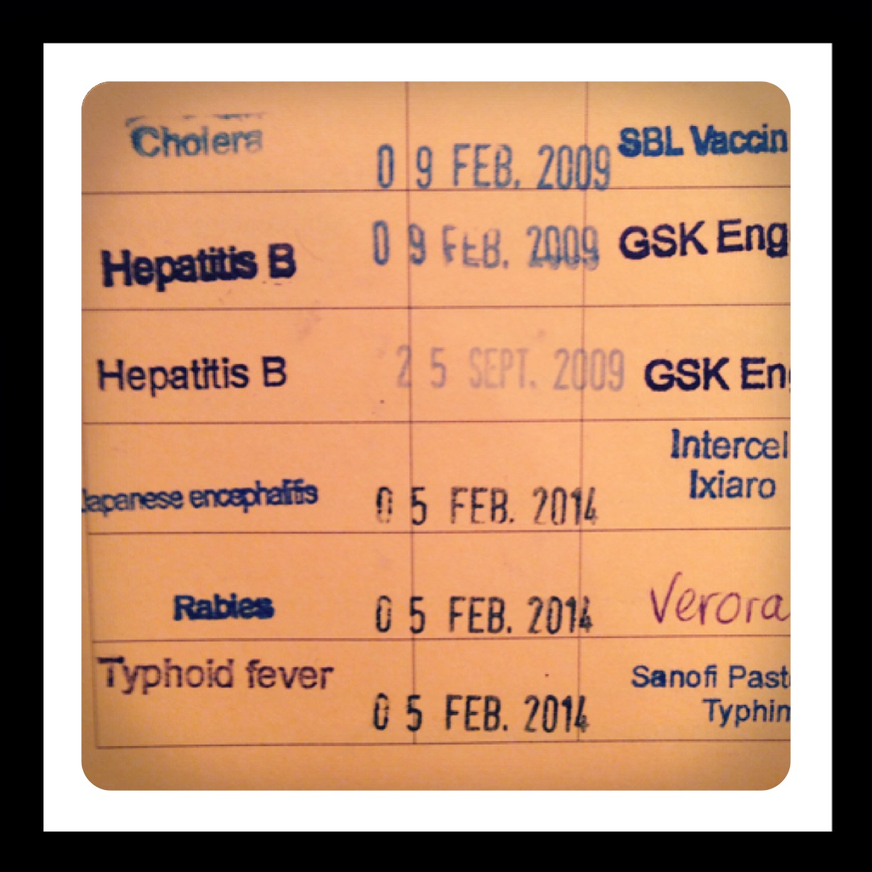 Anyhow; we got three shots each today, and as the picture shows getting coverage against Typhoid, Rabies and Japanese encephalitis (a kind of Dengue fever). We are scheduled to go back twice to “top of” a couple of these during the next four weeks.