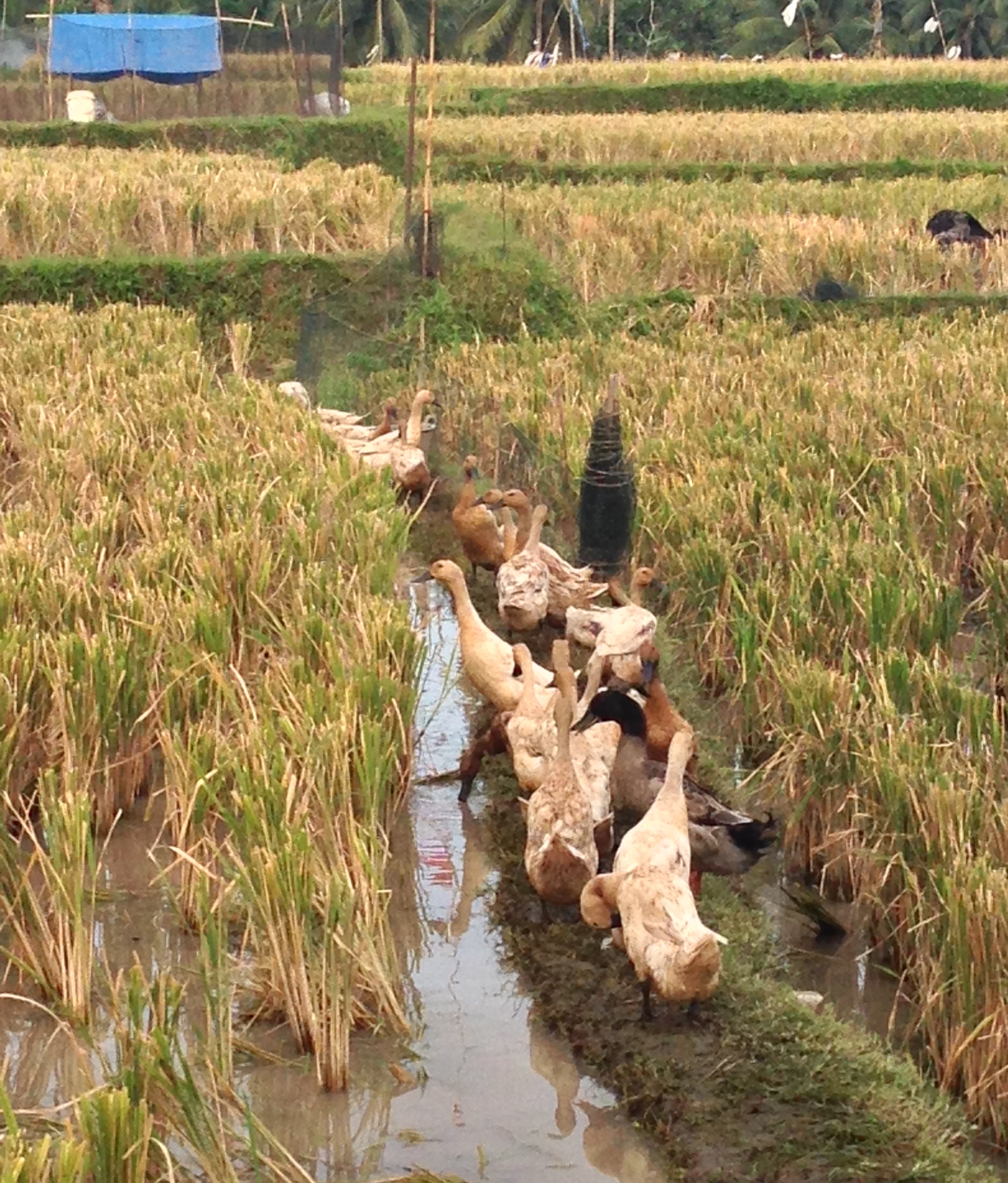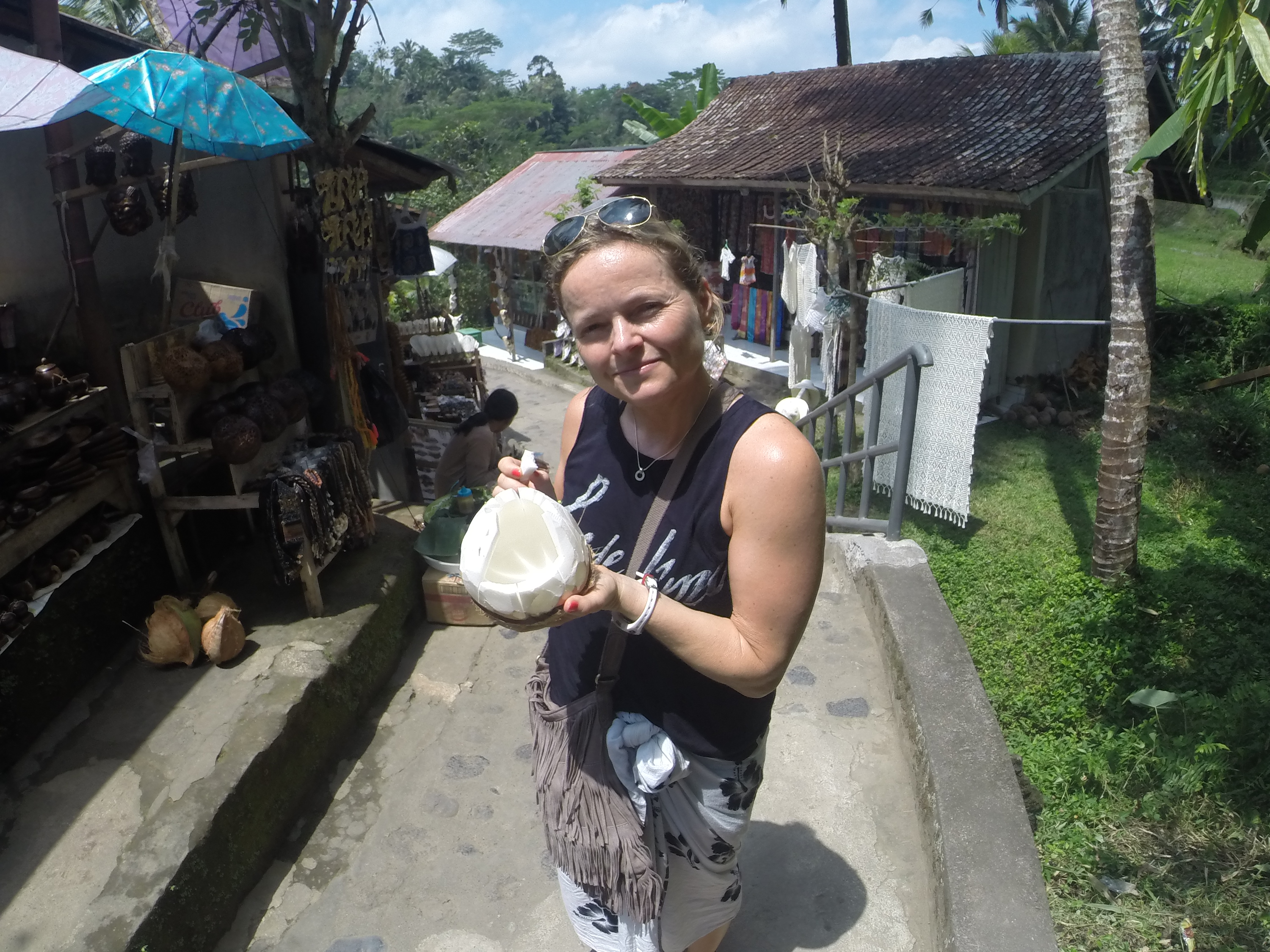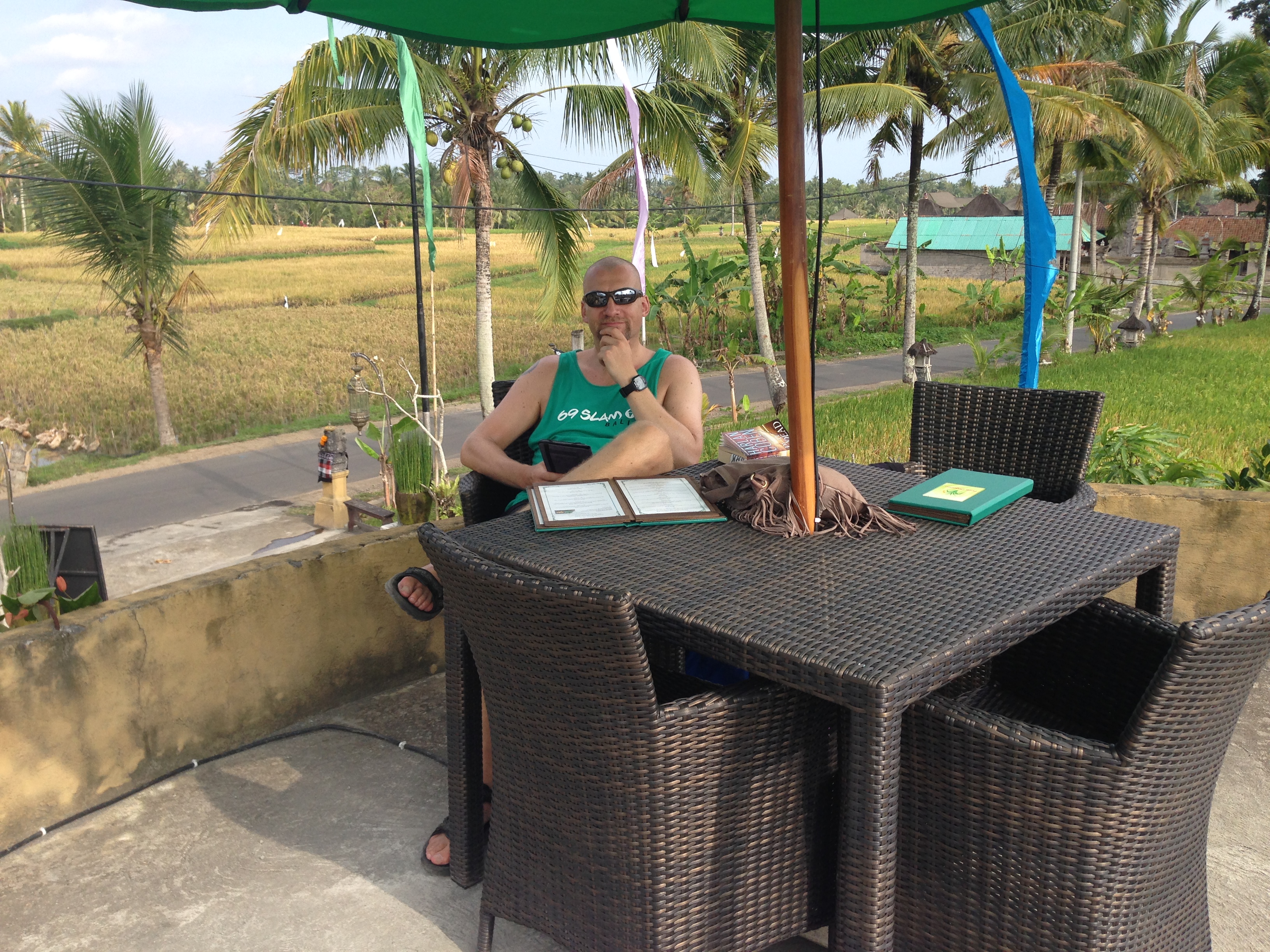 After our cultural round trip we set out with destination Ubud again. Along the way we found a restaurant with organic food, and stopped for a bite to eat. Actually this was our second lunch, as Katja (again!) got herself a larva of some sort in her avocado wrap. Yes, it happened in Sanur, and on the second try she got one more. It’s enough to loose appetite, so we needed a second lunch today. This place was great and they served good food, delicious coffee, nice tea and with a view of rice fields and gees. Yes, lots and lots of gees.