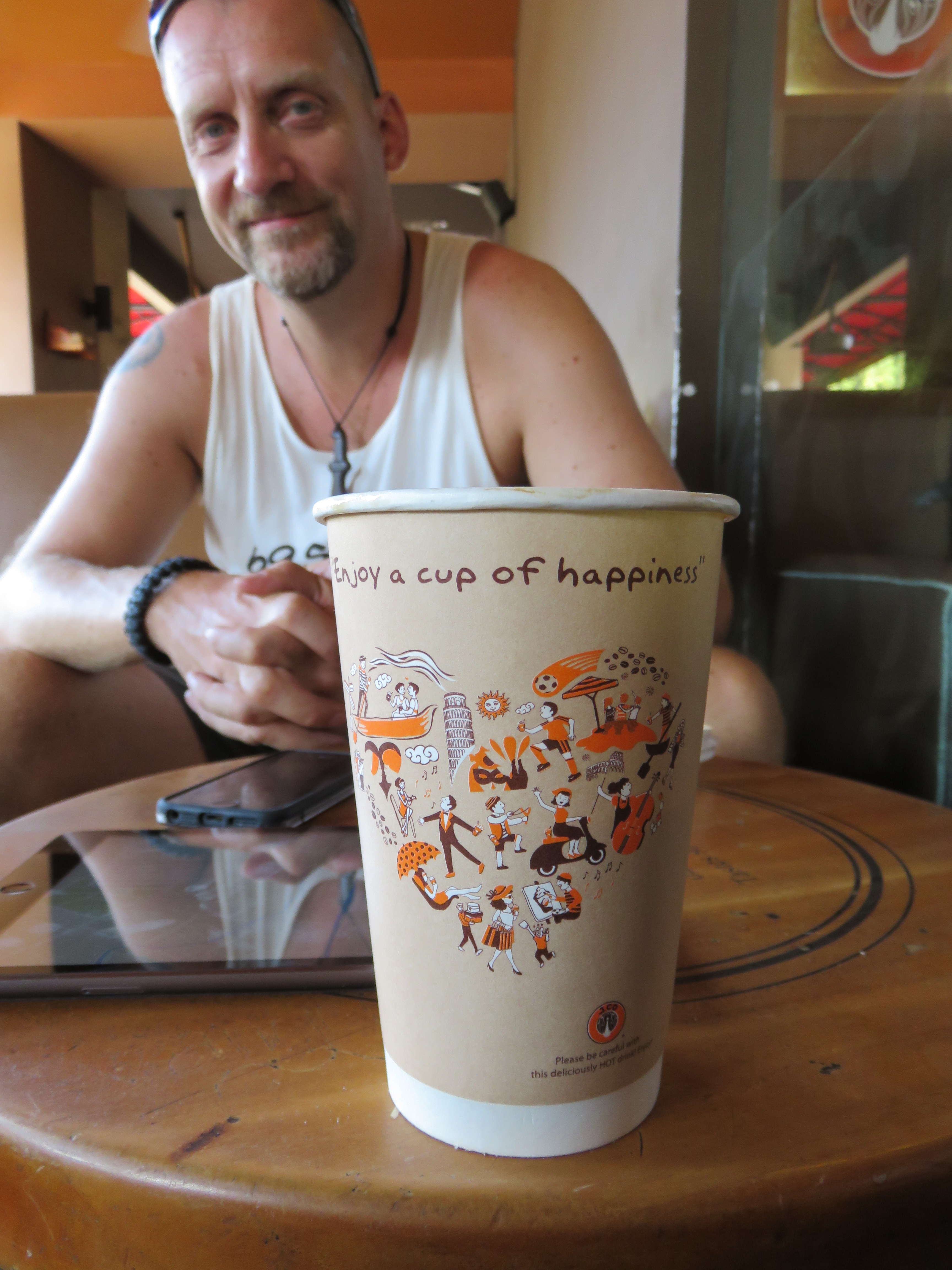 After this we thought of getting more coffee and set out for “Chico Coffee”. At least it sounded to us that way. It’s actually spelled JCo, but hey! we found it and we had a nice little Latte here. And check out the cup, just like our mantra for today.