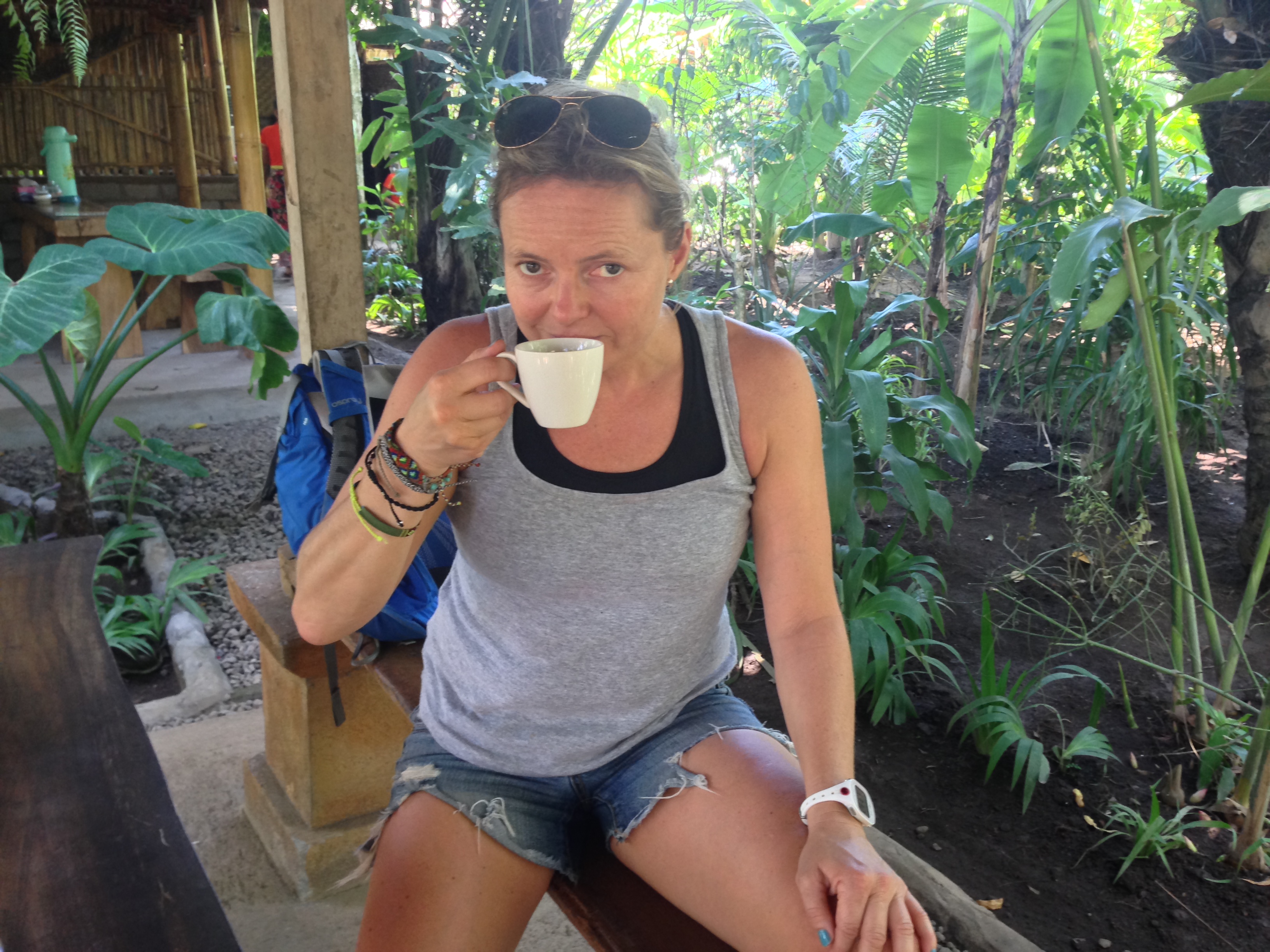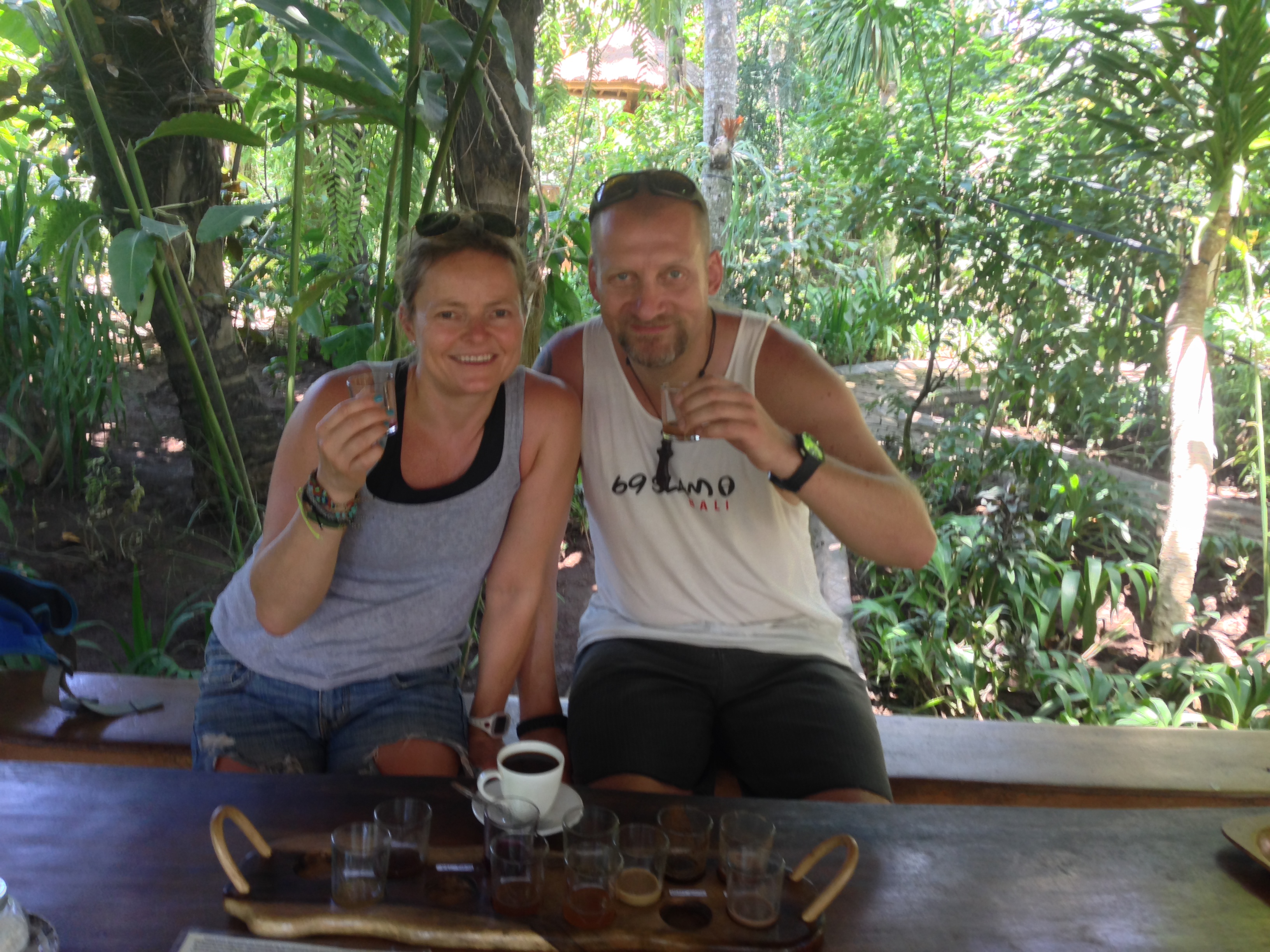 How could we say NO to trying this poop-coffee? For 5$ we had cup to share and it was just brilliant. Traditional Balinese coffee is powder coffee that you mix into water, and will leave powder in the drink afterward. This was made without any grains in the coffee, and was just nice tasting coffee through and through. After we had finished our tasting we ended the tour, through the shop. Surprise! But we did buy two teas and to coffee types. Including the poop-one. 🙂