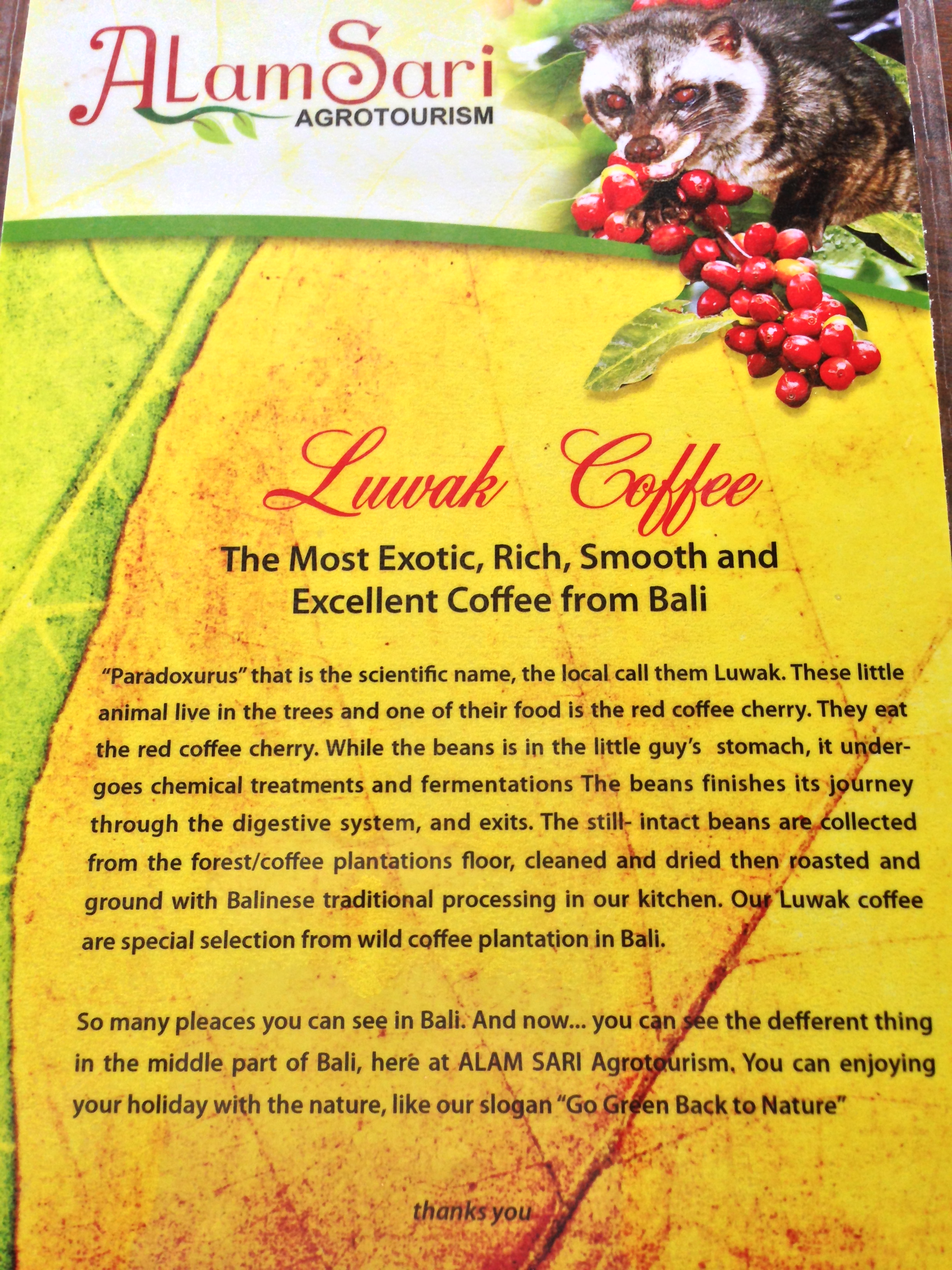 You are absolutely correct Arne. I have been to one of the coffee and spice plantations. Here I also did try the Kopi Luwak coffee amongst other coffee and teas. I did really like the mangosteen tea. The Luwak coffee is not all that great and the production of this coffee can be a little bit rude to the animals. But at a Eco plant it is OK and you get the shit, literally