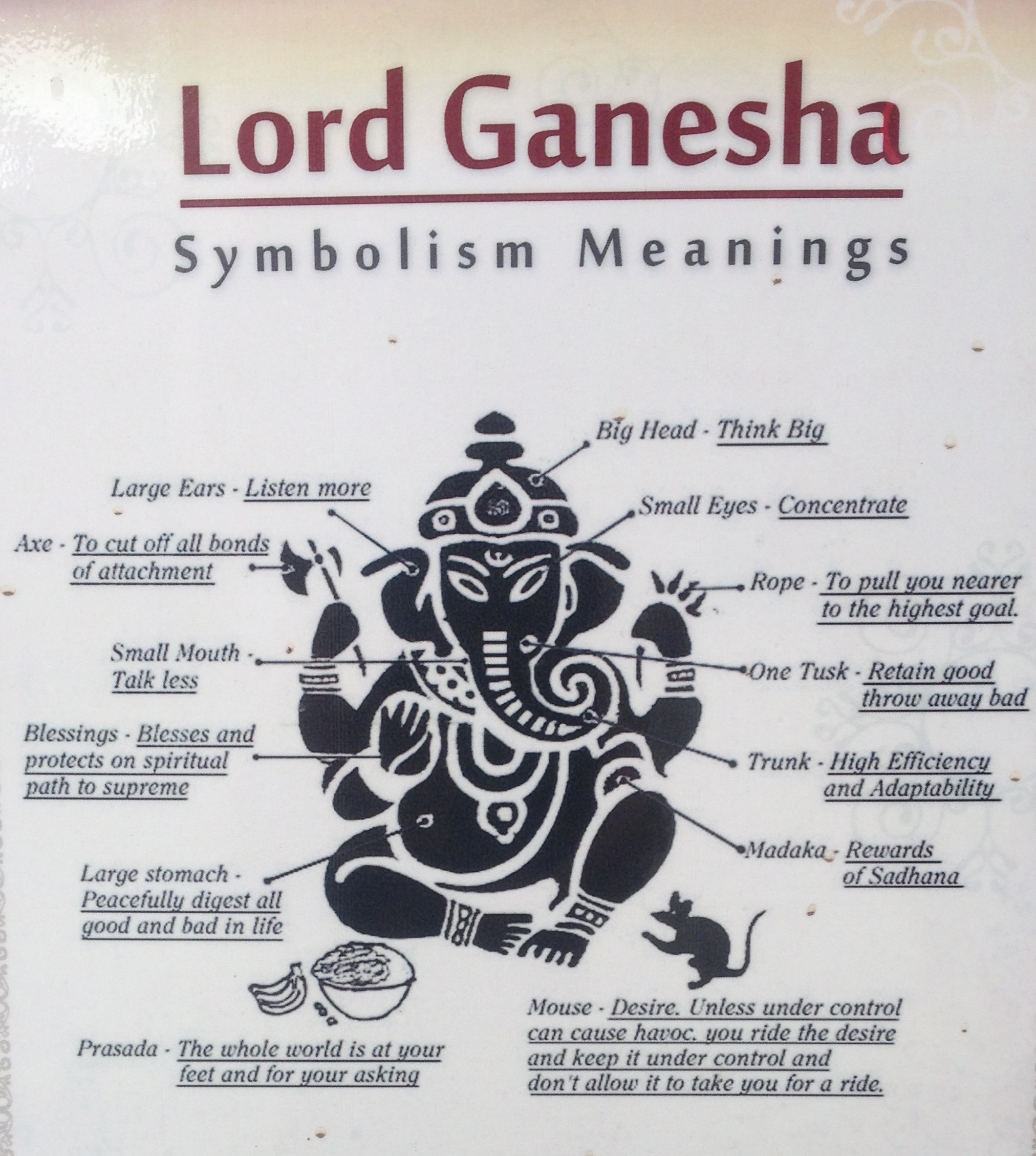 There are different stories to how he was born or created. Some say he is the child of Shiva and Parvati ( big figures within Hinduism). Other myths points to him being created by Parvati, or the most spectacular one – born from the elephant headed goddess Malini after she drank Parvati’s bath water that had been thrown in the river. I kid you not!