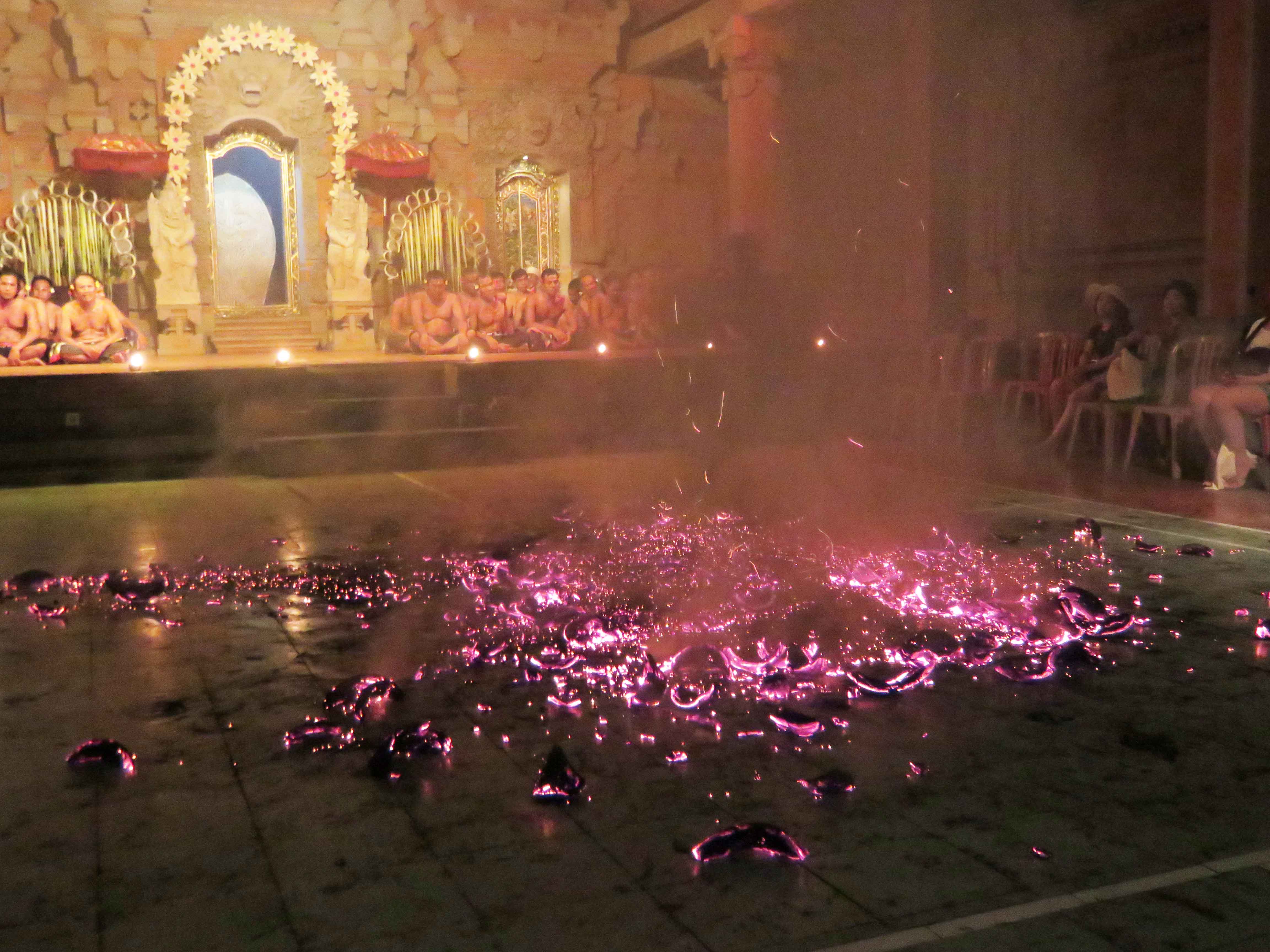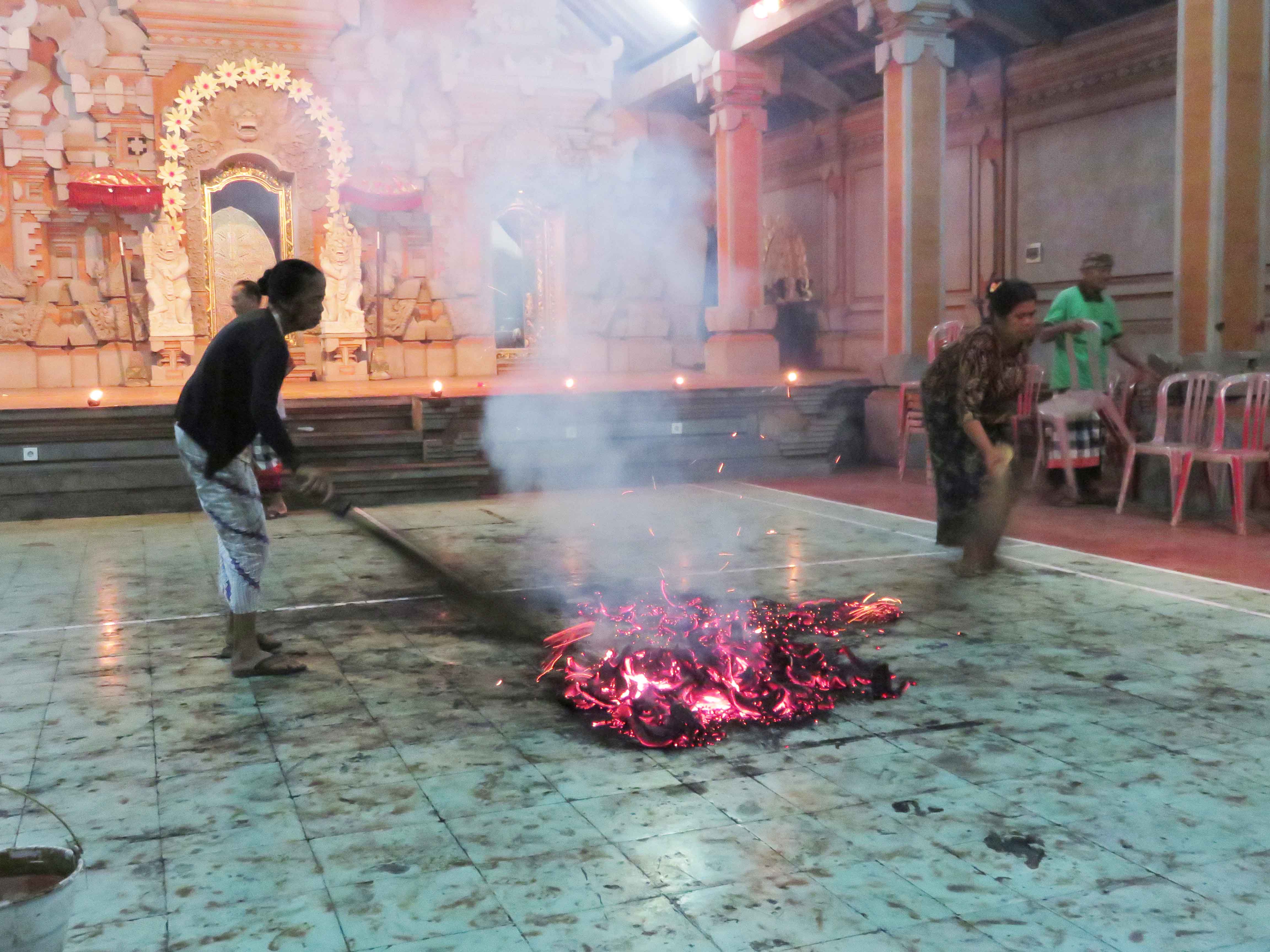 This guy played better than the two girls and he went all ballistic on the burning heap of coconut shells. He stepped in an kicked it, so fragments went all the way to the people in the front rows. Then a couple of old guys ran in with rakes, and gathered the fire back into one heap again. Over and over he danced into the fire (Duran Duran, anyone?) and kicked the shells pall over the floor. In the end he ran and “danced” on the embers on the floor and the to old guys with the rakes had to run in in flip flops and take him down. Remember, he was entranced. So they hold him down as he wants to go back dancing, but he regains his composure when the priest sprays him with holy water.