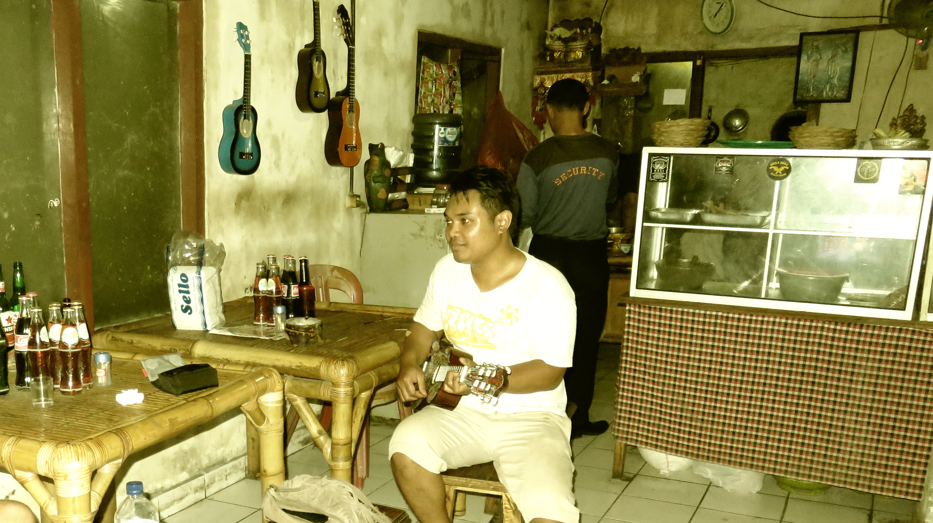 there. He really dosen’t do anything, but is always nice and friendly. And I put chef in quotes as there probably is a more suitable word to present his cooking skills. We have earlier mentioned that there are a lot of small guitars on the wall there. We asked if the chef played, but he just smiled and pointed at the nice guy (that we still don’t know what’s doing there). But he plays some guitar, though preferably the normal sized ones, and sing a little. So we got a little intimate concert with a quality that I could match. Those who now my guitar playing skills now that is not a boost for the other guy. My four chords nachspiel versions of a few songs is but all I can muster. So I played a couple also. And then the chef was really impressed. He wanted us to take a picture with him and me, and he even borrowed the guitar from the the nice guy to have one for the photo. As you can see, we’re having a blast. There is a photo shop here in the street where we live. I’m thinking of making a print of it and ask it to be placed on his wall. How cool would that be? Being made (temporarily) immoartilized in a local warung in Ubud. Just has to be done. 🙂
