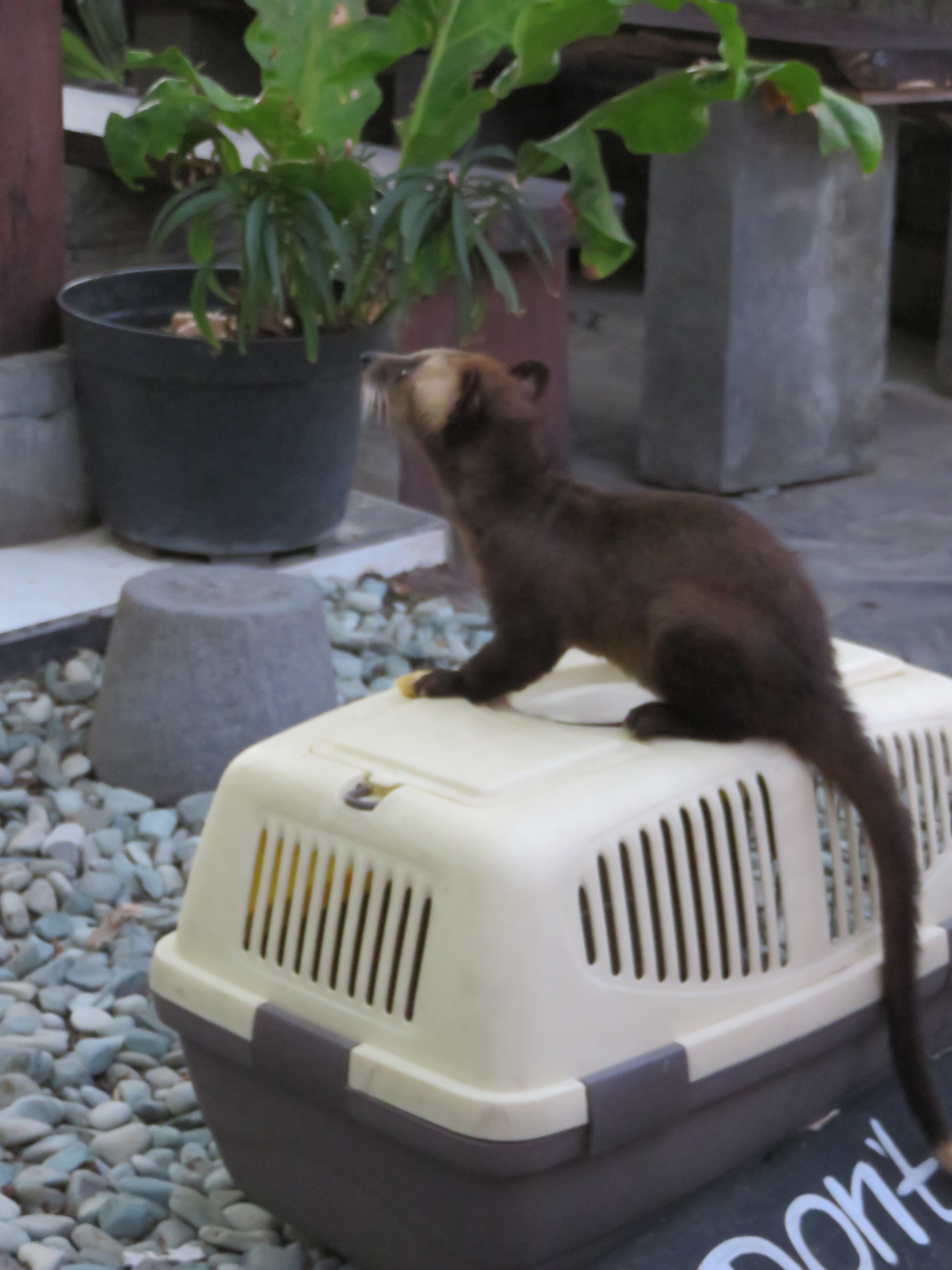 The sunset was quite nice, and we enjoyed it at a local cafe up on the cliff overlooking the temple. On the way there we found a local attraction. A guy with two bats and five Luwak. The Luwaks you remember from the earlier mentioned poop-coffee. So this place was a kopi Luwak place. But not only were these small furry animals an attraction, the guy had to big bats sleeping on a rack. Yeah, that’s right. You thought I talked about baseball bats? Nope, this guy had live bats in his coffee shop. And they liked to lick this guys arm as he passed them. He sold little coffee, but were the most popular stand there.