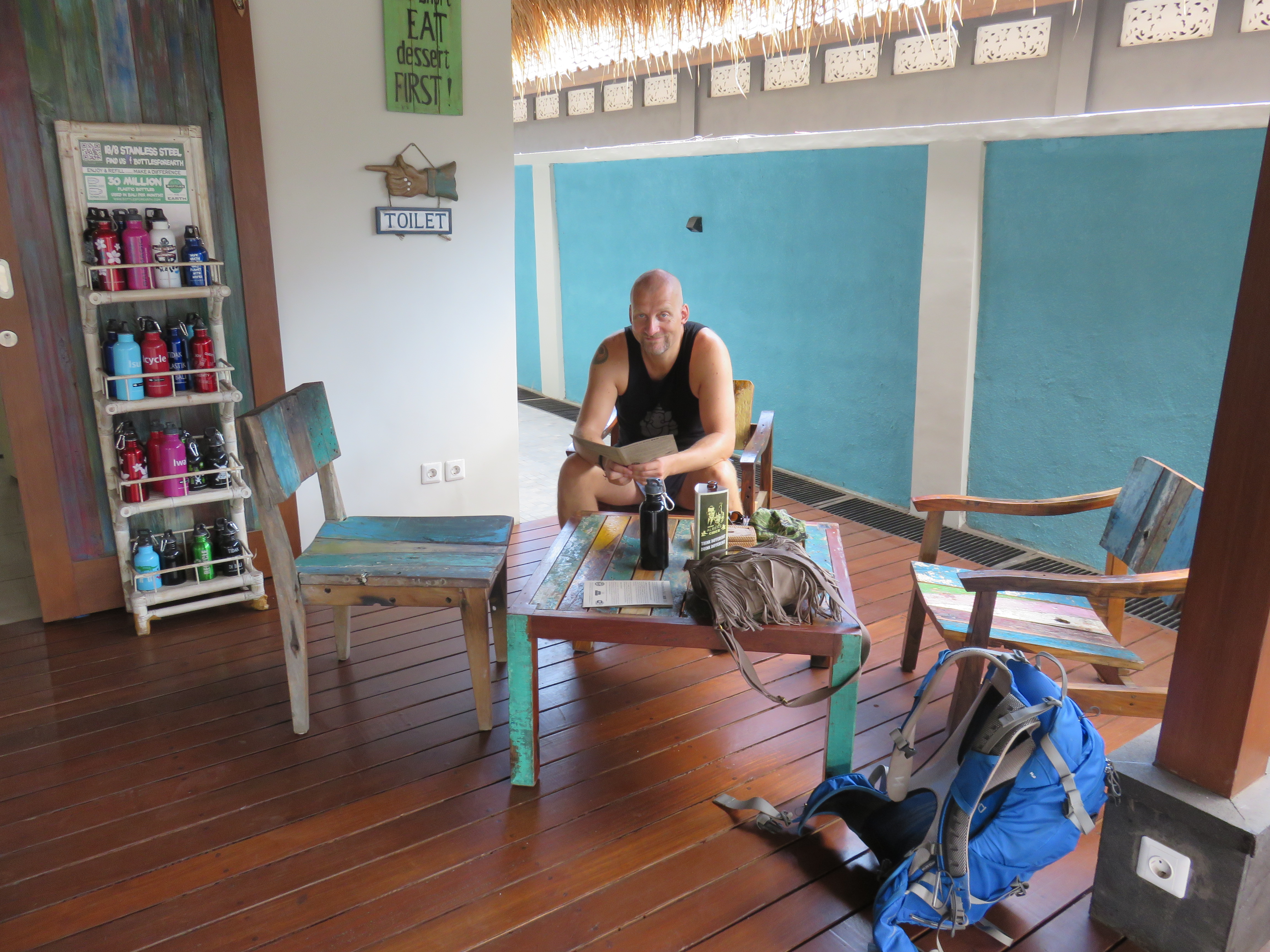 We stopped at the Eco Deli around the corner. It’s a “homemade” place where we can confirm the sell delicious brownies along with tea or coffee. We also bought our new water bottle here. A “Bottle for earth” to reduce the number of plastic bottles we run through each day. Bali runs through 30.000.000 bottles of water a month. That’s a huge number, and there is little to no recycling around here. Think of that plastic waste. Let’s try to do a little to reduce that. Well worth a thought where ever you are. Bring a bag or net to the store to avoid to buy needless plastic bag for your groceries. The world will thank you, even though no one else does.