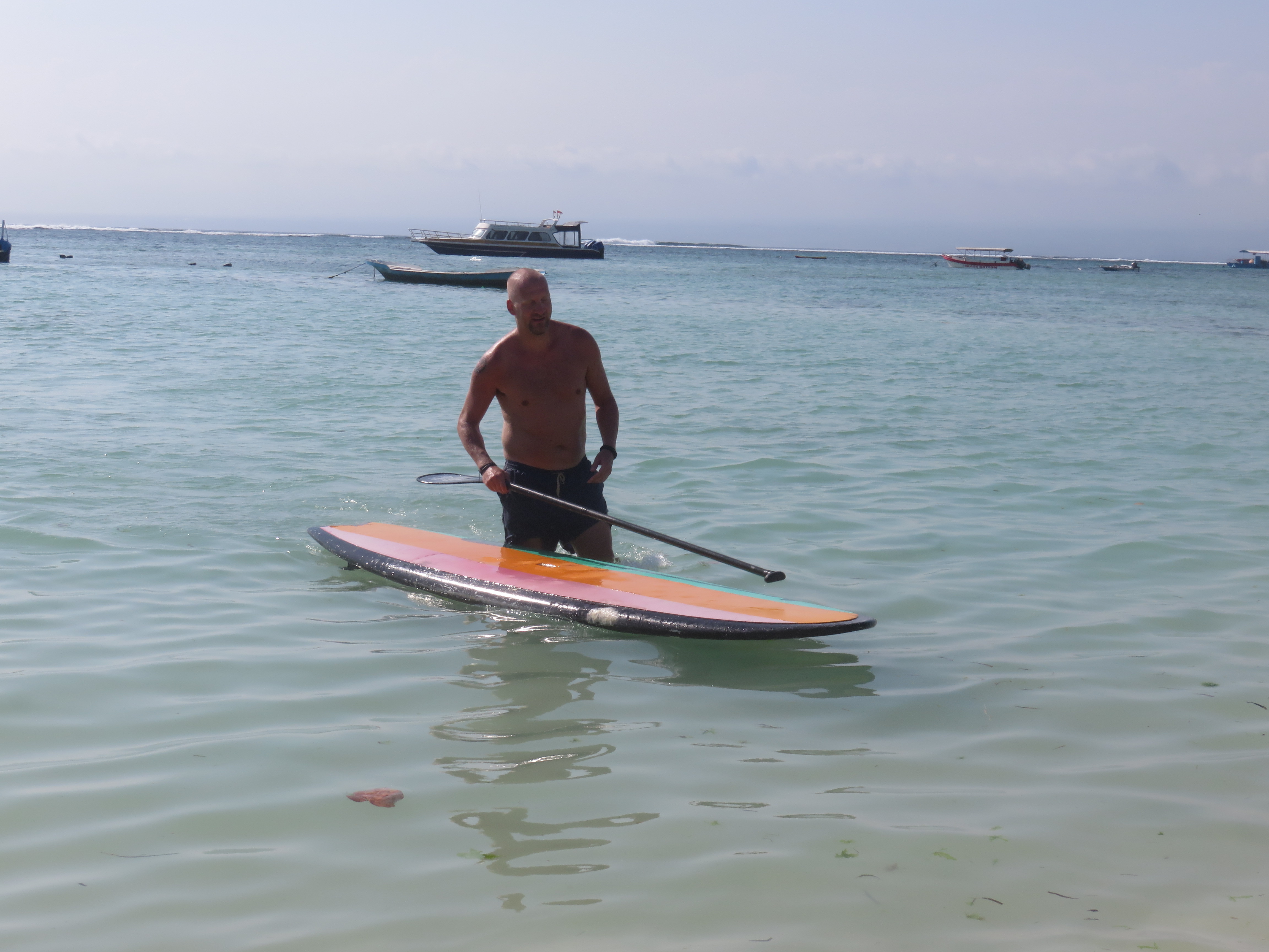 Down to the beach we went. We dove into the water and it has not been this warm since our arrival to Indonesia. After watching a stranded ferry get loose by burning 250 hp in a futile a attempt, we rented SUP – Stand Up Paddleboard. Oh yeah, out to sea! The man said:”Quick lesson. On knee first, on deep water try to stand.” Then he laughed and said: “Hurt not so much to fall in deep water”. Then he left us. Katja beat me straight out of the starting block. She did not fall once. Me on the other hand can verify that it is more soft to land in deep water. BUT – in the formal competition between us I ended victorious and am now Lembongan champion in SUP. Maybe even Indonesian Champ, since I think this must have been the first real contest arranged. That takes away some of the sting from the hard landing in shallow water.