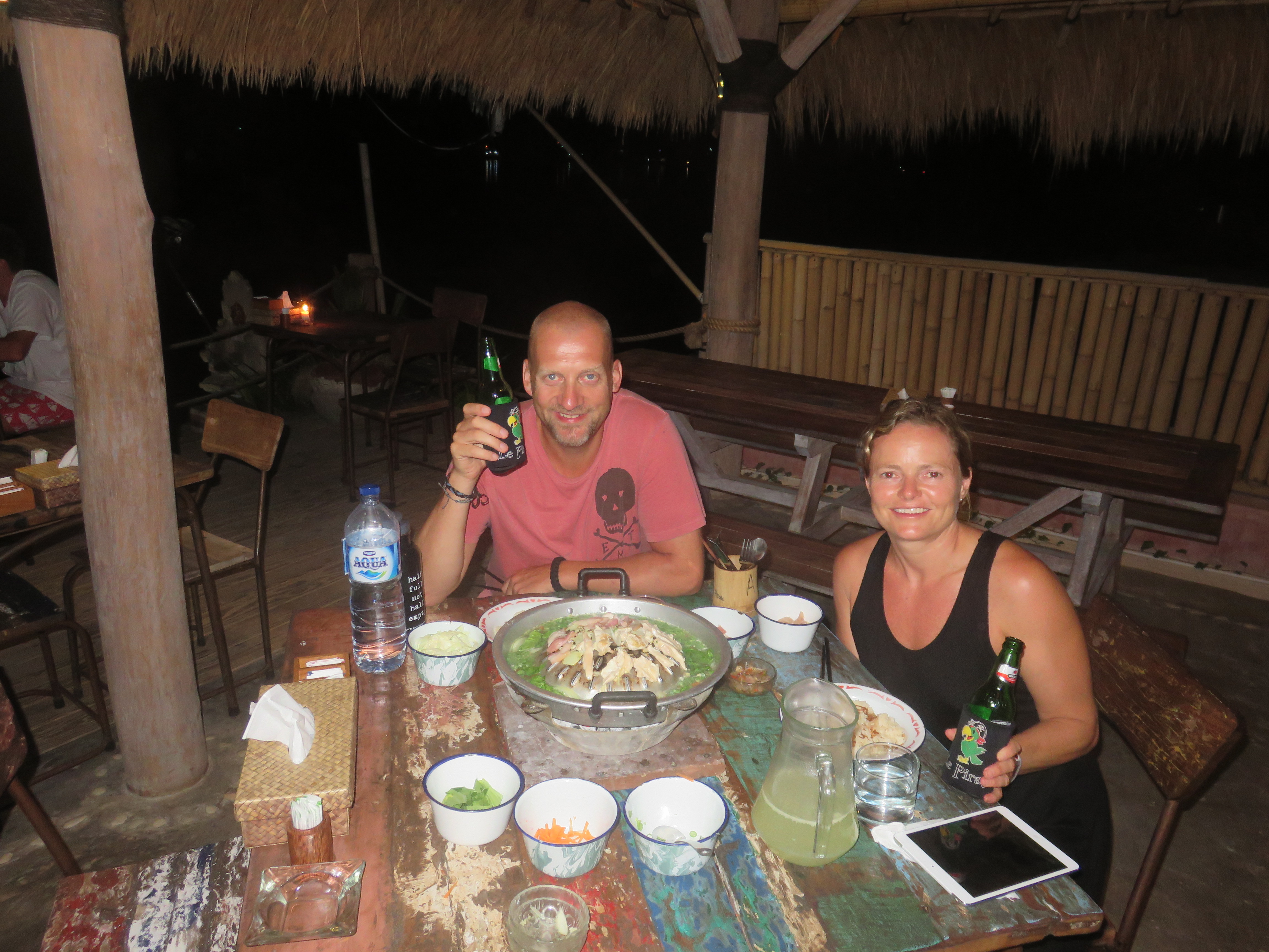 For dinner we were recommended to do the Thai BBQ. It’s a concept none of us knew from before, , but it is somewhere in between Japanese Shabu-Shabu and Fondue. We got lots of veggies and meat to the table. Then a BBQ device like nothing we have seen before. We used chicken broth in it to heat and cook the veggies and a half sphere in the middle to BBQ the meat (chicken and bacon). The whole thing was fired up on coal and it was a cool way of making dinner. It tasted awesome, and several of the other guests came to look at the thing. Some ordered the same afterwards.