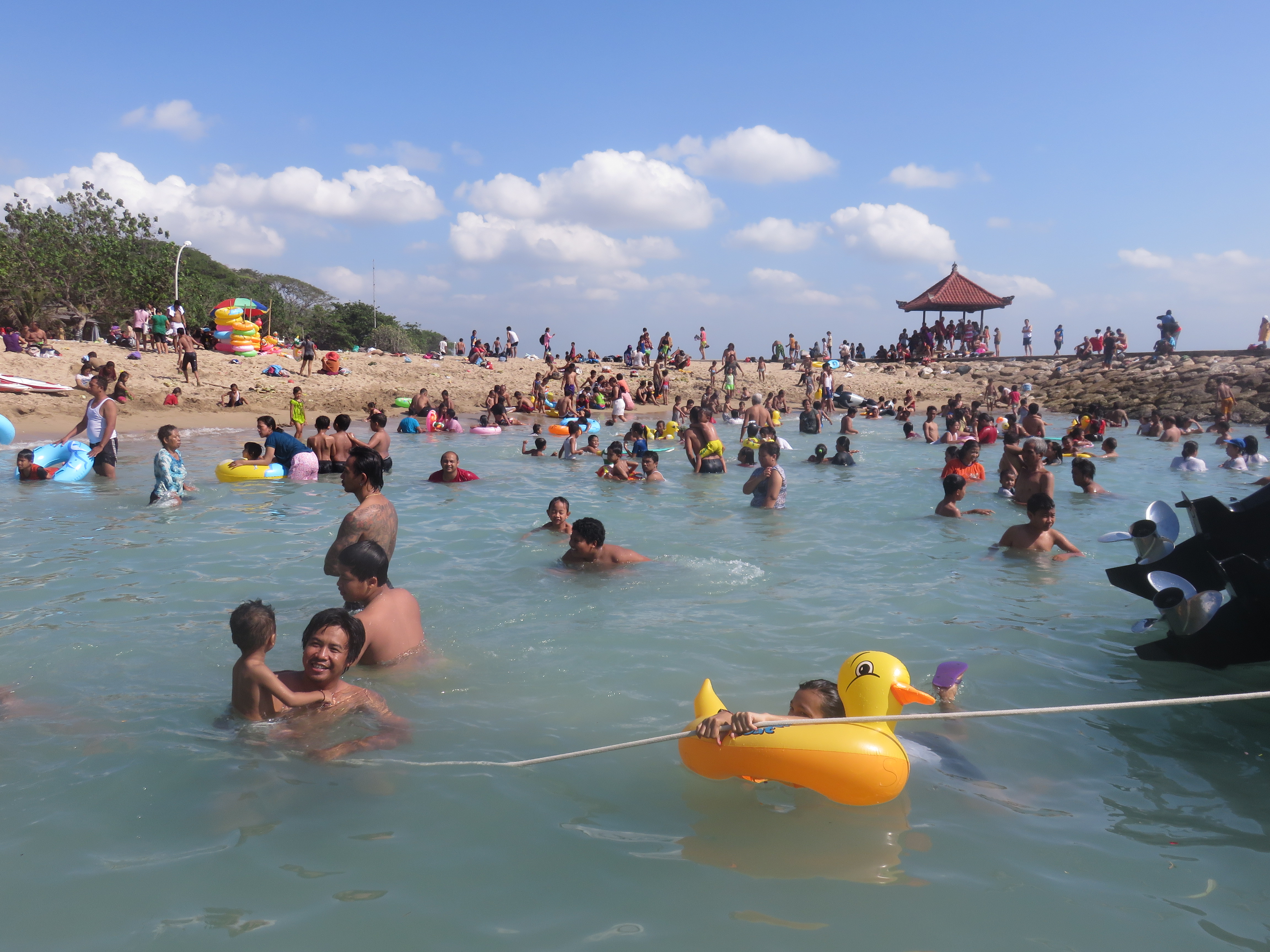 It’s hard to get a grip on why, but both on Bali and Lembongan there was big religious activity. That means that today (Sunday) is some kind of holiday, and it was crowded on the beach. It looked like all he locals wanted to take a swim today. It’s cool to see they have days and time of to enjoy the water, as we tourists do every day.