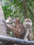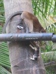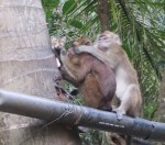 We get back up on the bike and head back towards Puerto Galera. We had seen a little beach on the road and stopped there to rest. We pay our entrance fee of 20 pesos (0,35€) and are just blown away. Not from the beach, but from the local monkeys. One is chained up and the other, we get explained, comes from the jungle to visit. And the visitor is what catches our undivided attention because it has adopted a kitten. It sits there on the bamboo stick and cuddle the kitten. I let the video show what I mean.