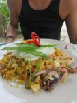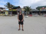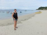 We spend just a little time down at the beach before we need some food. We get back on the road and pass through Puerto Galera on our way to White beach. So many shops, so much junk, so little food. In White beach we find a restaurant called Rumulus and order “Special rice”. Katja order without Calamaris as she got enough squid in Quezon City Park. We get a salad first and it’s probably the best one yet here in the Philippines. The rice is also very tasty and we enjoy it in spite of all the flies. It was like being back in Perth. Man, I hate flies. If only they would sit on my clothes, but no. They have to tickle my shoulders, head and legs. As soon as we’re done we hurry down to the White beach itself.