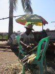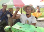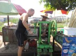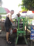 Right next to us a man is stripping sugar canes and making ready to make sugar cane juice. I walk over and ask to take his photo and he smiles with the characteristic reef smile from the chewing tobacco. When I ask him how the whole process works he eagerly shows me. The stripped sugar canes are placed in water to soak up more. After a while they use an old apparatus to grind the cane. As it gets more and more mushy it’s folded over and over to squeeze out as much juice as possible. As he shows med this all the locals are watching, thus it’s obviously not common behaviour at the docks. At one point he asks, by gestures, if I want to swirl the handle for the apparatus. I eagerly jump to the occasion and put my weight behind it. It’s heavy, but with a little effort we crush through the last party of the folded cane. Now the locals are all in and come to show their appreciation for their sugar cane juice maker. One guy makes him flex his right biceps which are larger than mine, but his left is not half that size. We all laugh and giggle and we return to our tea. We order some veggies from the tea lady and get served rice and beans. It tastes good and we look at each other. We have previously talked about not eating unsafe food when we are to travel. Being food poisoned is bad. Being food poisoned while having to flying out ride any kind of vehicle is death. We shrug it off and hope for the best.