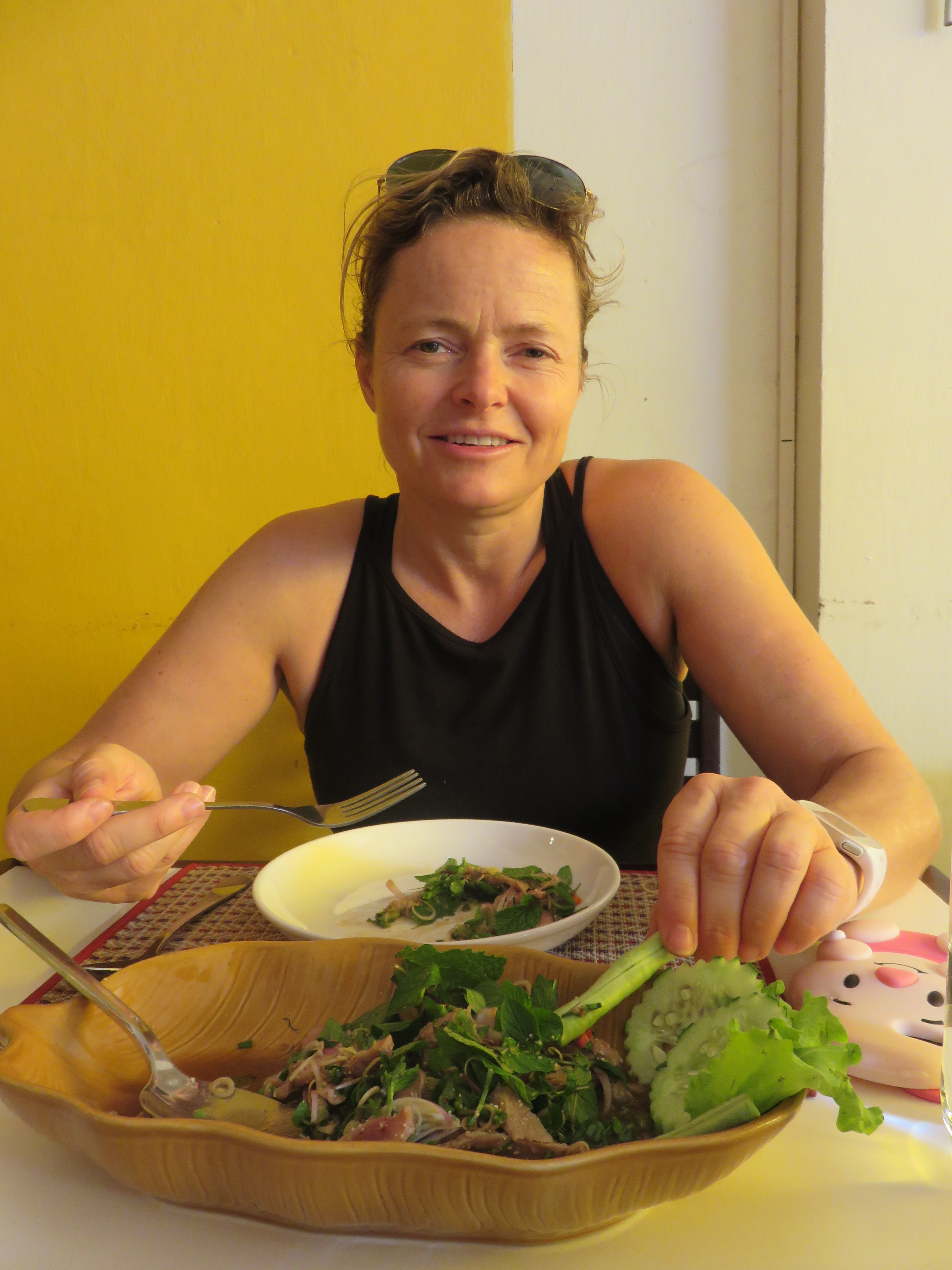 We don’t wait more than five minutes before the bus arrives. This is working our very well. Katja sleeps a little while I read on the way back. We get off a little before the main bus station and head towards the hotel and a restaurant we’ve seen there called Lao Kitchen.