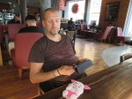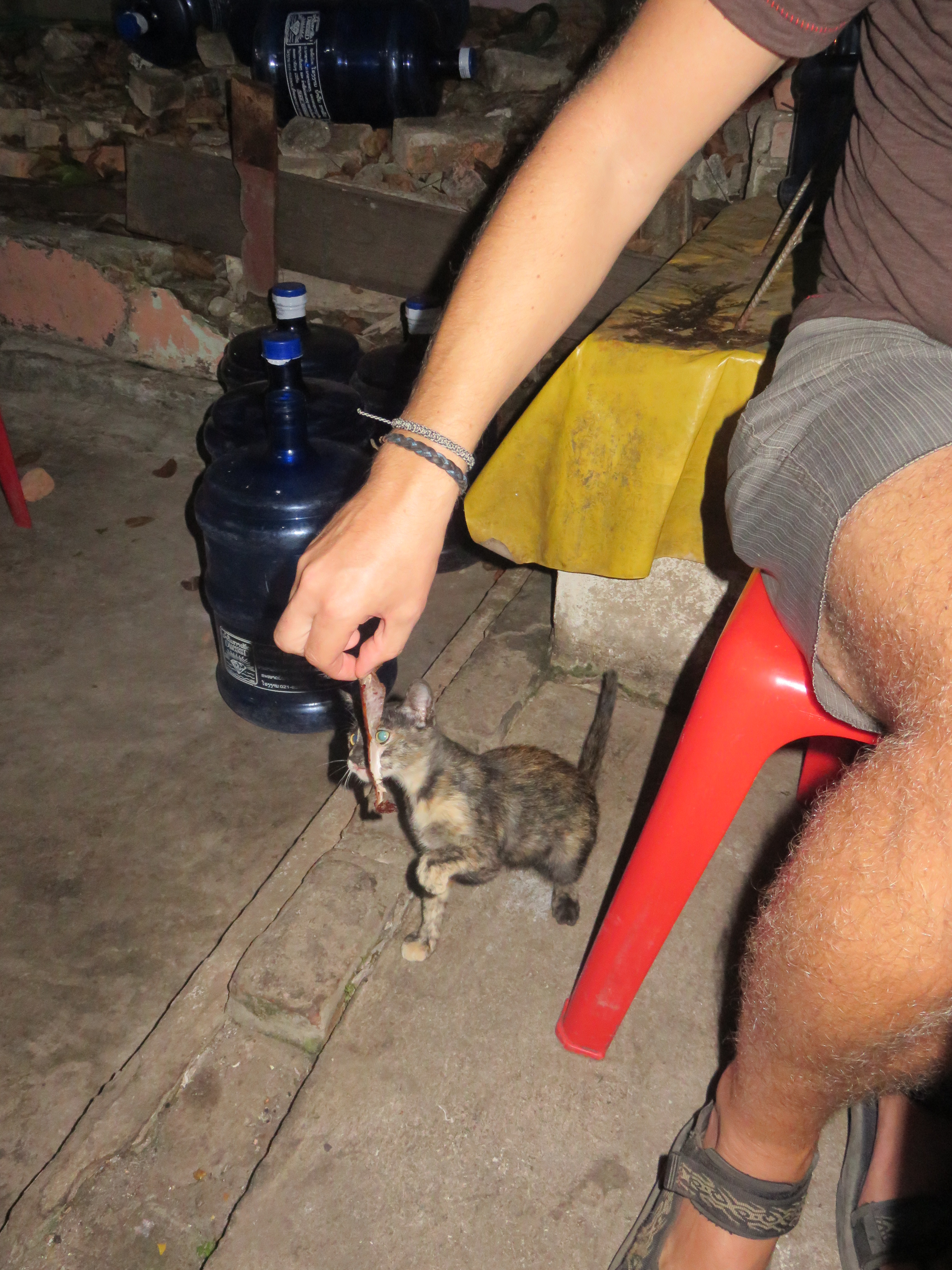 We make ready and go out again for the walk in the streets of the old town. It’s closed for traffic today as well, so we go out and find a place to eat. We pass by a restaurant that looks cheap, but has loads of people inside. Inside and inside, but at least it’s under a plastic roof. We enter and get a table normaly used to store ingredients for the bar. The food is good, but nothing compared to the entertainment the little cat gives us.