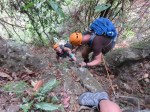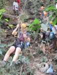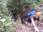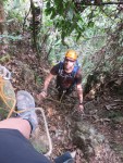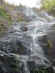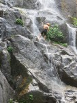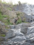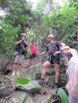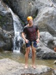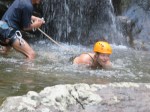 We change into bathing suits and shorts and head up to the top of the waterfall nearby. From here we’re to rappel down through the waterfall to the pond at the bottom. This is a new experience for most of us, and there is a lot of nervous laughter and snickering up at the top of the waterfall.