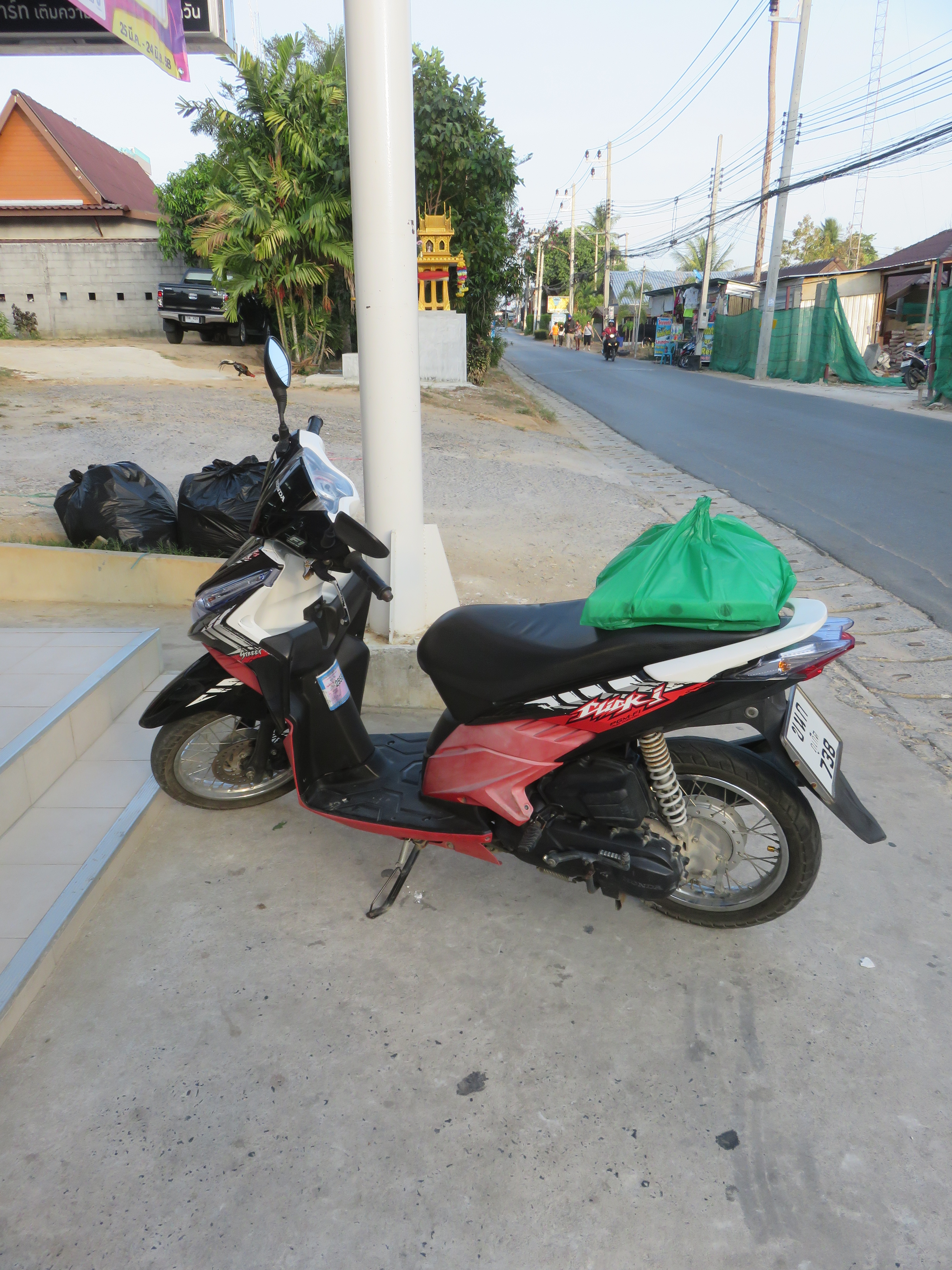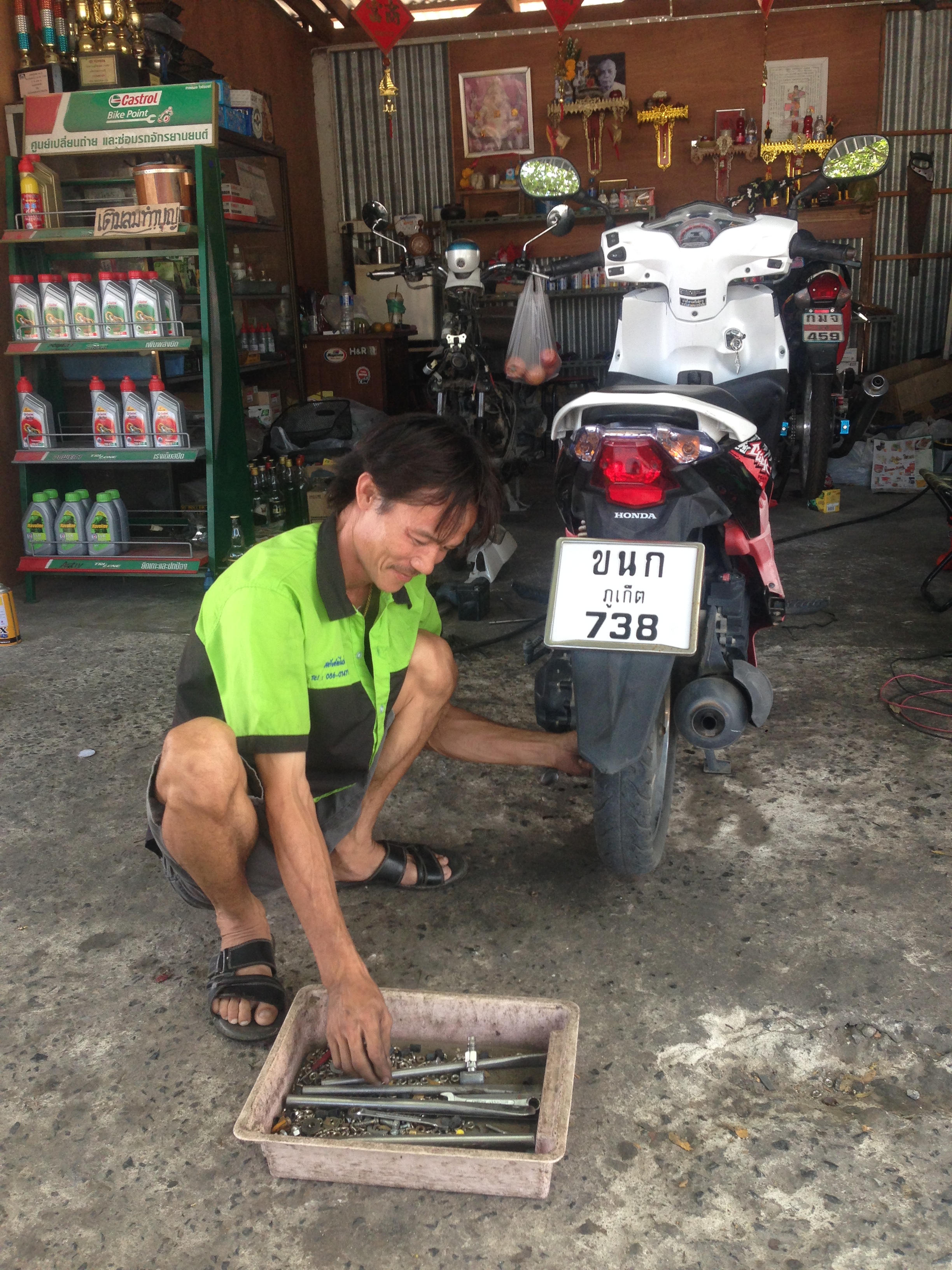We ask some locals and get sent further down the road. Katja goes into a store while I drive on. I find the little repair shop and get a new hose with the labour for only 160 Bath. That’s about 40 NOK our 4€. I guess the shear number of motorbikes, and thereby needed repair, makes the parts cheap. It’s all fixed I’m matter of minutes and I go back to pick up Katja and continue our journey.