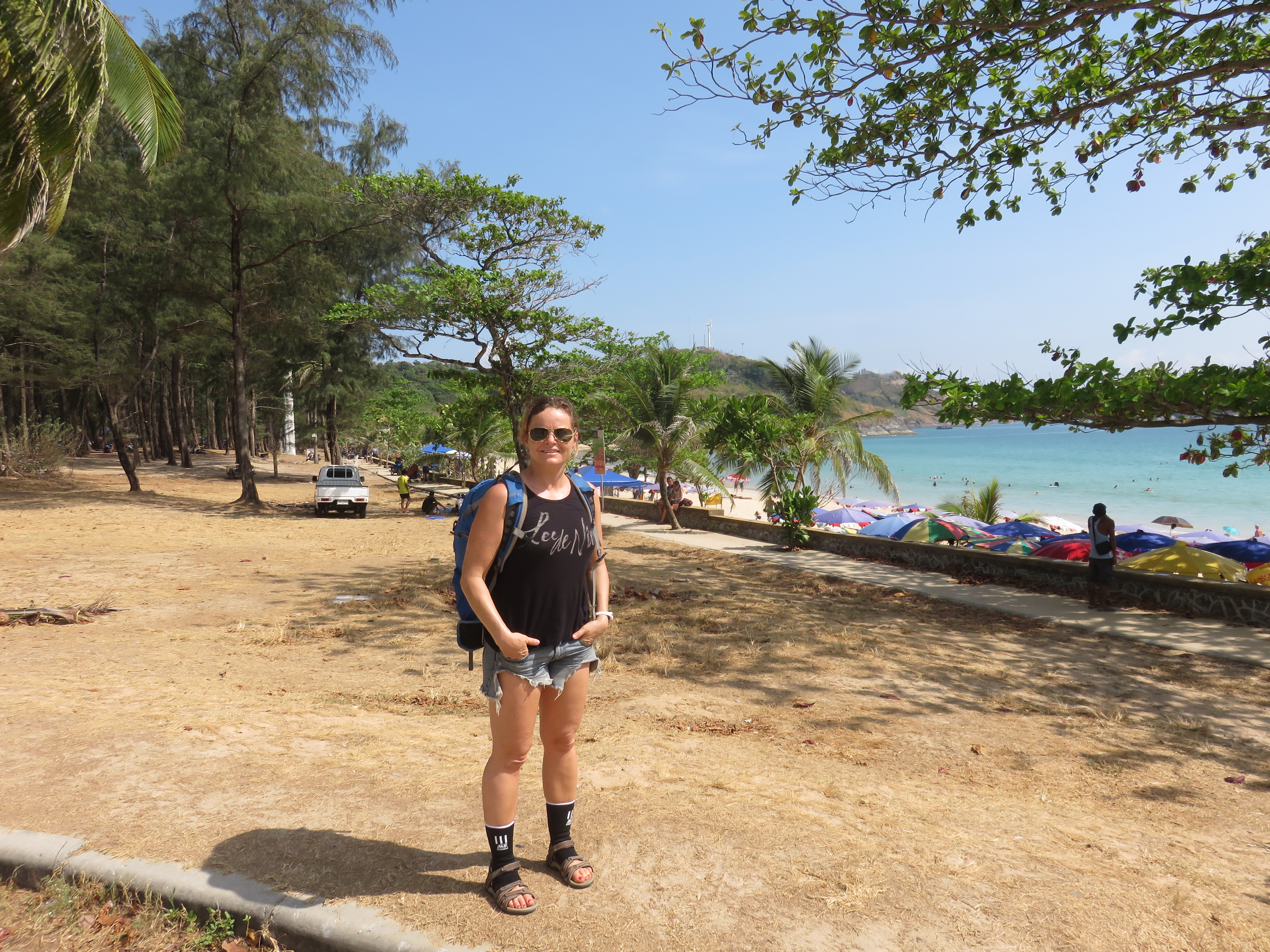 We load her up on pain killers and put on the braces and go for a ride. We want to visit another beach, and aim for Nai Harn. We’re about half way there when the rear tire collapses. The speed is just above forty km/h so it’s no danger.