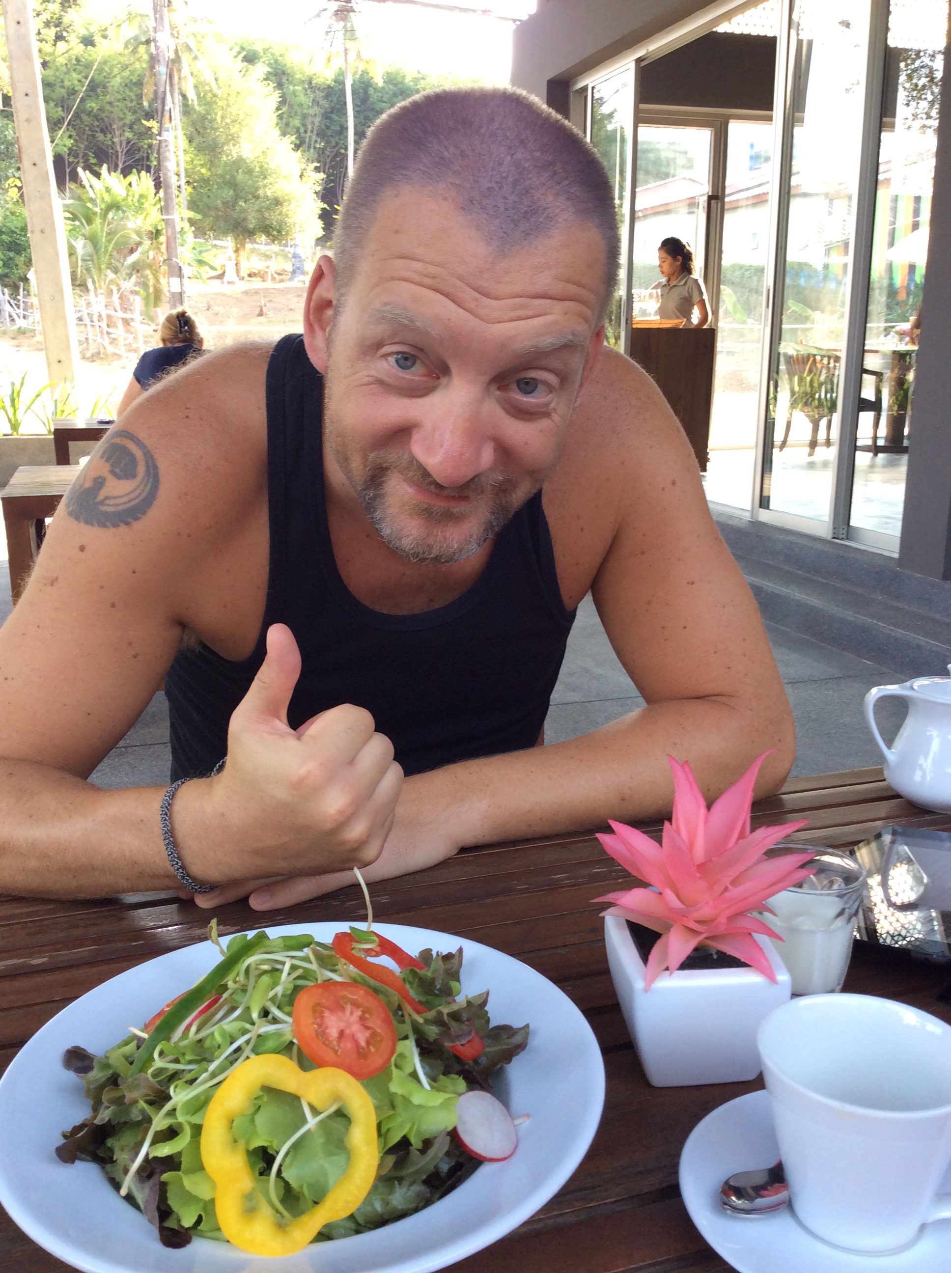 When they’re finished with the drilling and move on to sparring I drive down the road and get myself a haircut.  Katja had spotted a sign advertising haircuts for sixty Bath. I go there and find an old lady that keeps talking Thai to me the entire time. Still, my choice of haircut is rather limited, so we get it done. Then she moves on to trim my beard from all possible angles. She finishes with a pat on my back while exclaiming: “Sexy!” I guess Mr. Handsome is back to woo the old ladies of Thailand.
