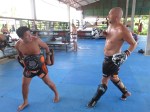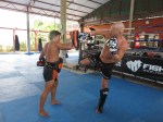 I spend the most fun hour of Muay Thai with Moo. We do defensive techniques, double kicks and correct (or at least we try to correct) my many flaws. I’ve mentioned it before, the differences in both stands, kicks and movements in comparison to where we come from. It’s hard to turn off twenty years of training to do it the correct way here, but I try. And to a certain degree I succeed, but there are a lot of practice hours until I can separate, or compartmentalize if you will, well enough between the different styles. Still, it feels good when you feel the power and the impact of a well timed and correctly delivered kick. Then again, the pain in the shin bone when you twists to much and hit the edge of the pad is equally strong. In have the bruise to show for just that. But I’m super happy with Moo and am booked for another session tomorrow already.