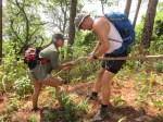 Now we’re almost down at the temple of Doi Suthep temple. Just a short trek through the last of the jungle and we’re amidst taxis and tourists again. This temple it’s a must see here in Chiang Mai, so I guess we’ll drive up another day. Right now we’re not dressed appropriately for a temple visit. We’ve walked for five hour and forty minutes. A good hike through the jungle.