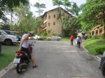 We pack a bag and move over to the pool. It’s been deep cleaned and looks a lot better than when we arrived. The beds are surrounded by ants, but nothing a garden hose and little water can’t fix. The hotel looks great from here by the pool side. A little waterfall splashes water into the pool, and we’re the only ones here. We look over at the restaurant, but the waterfall takes away all the noise of people talking over there.