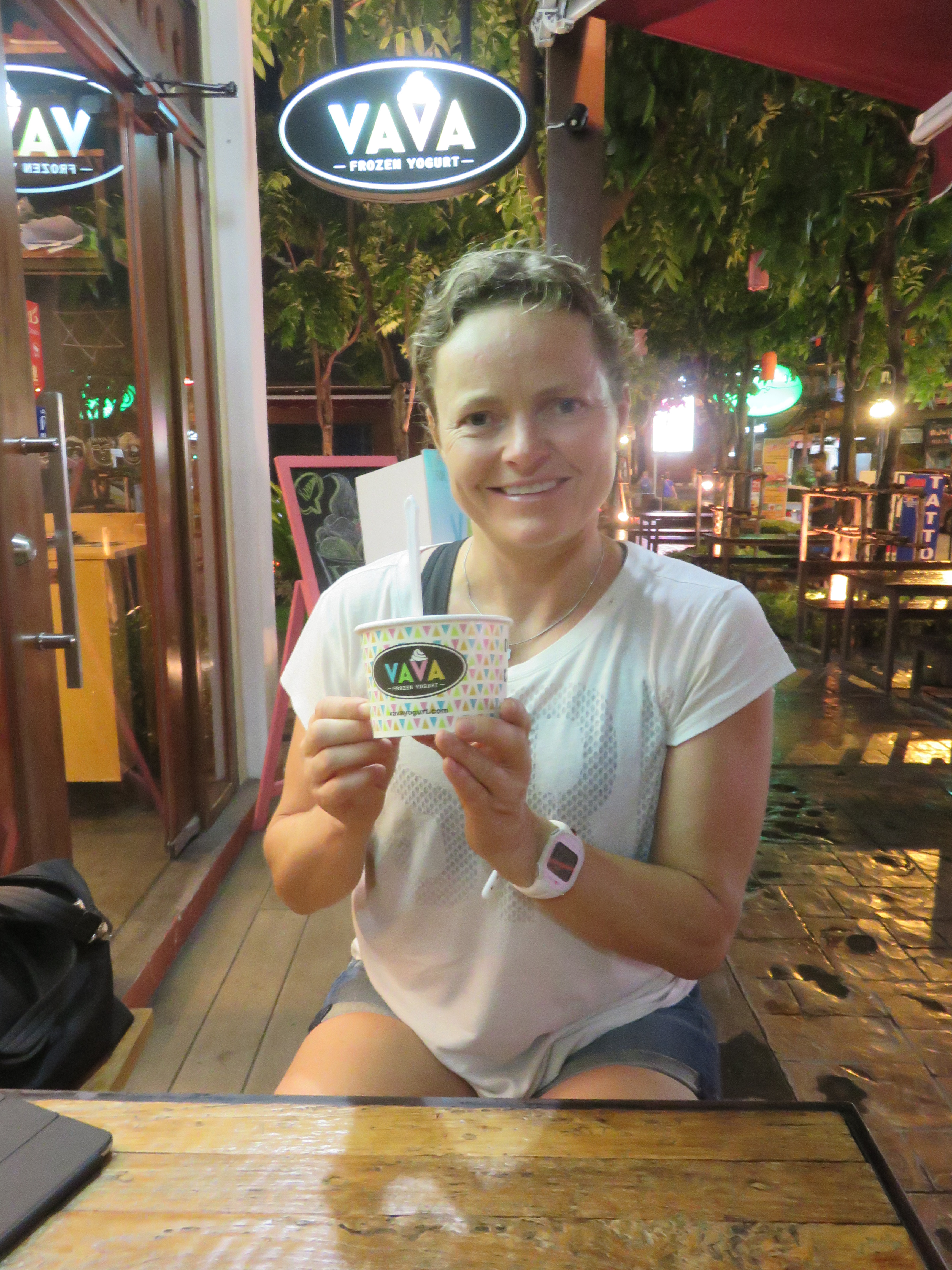Katja wants frozen yogurt instead off pastry so wet drive into town to a place we’ve spotted. I get a taste of her’s and it’s really delicious. Seems like they’re far apart but good, the ones we find here in Asia.