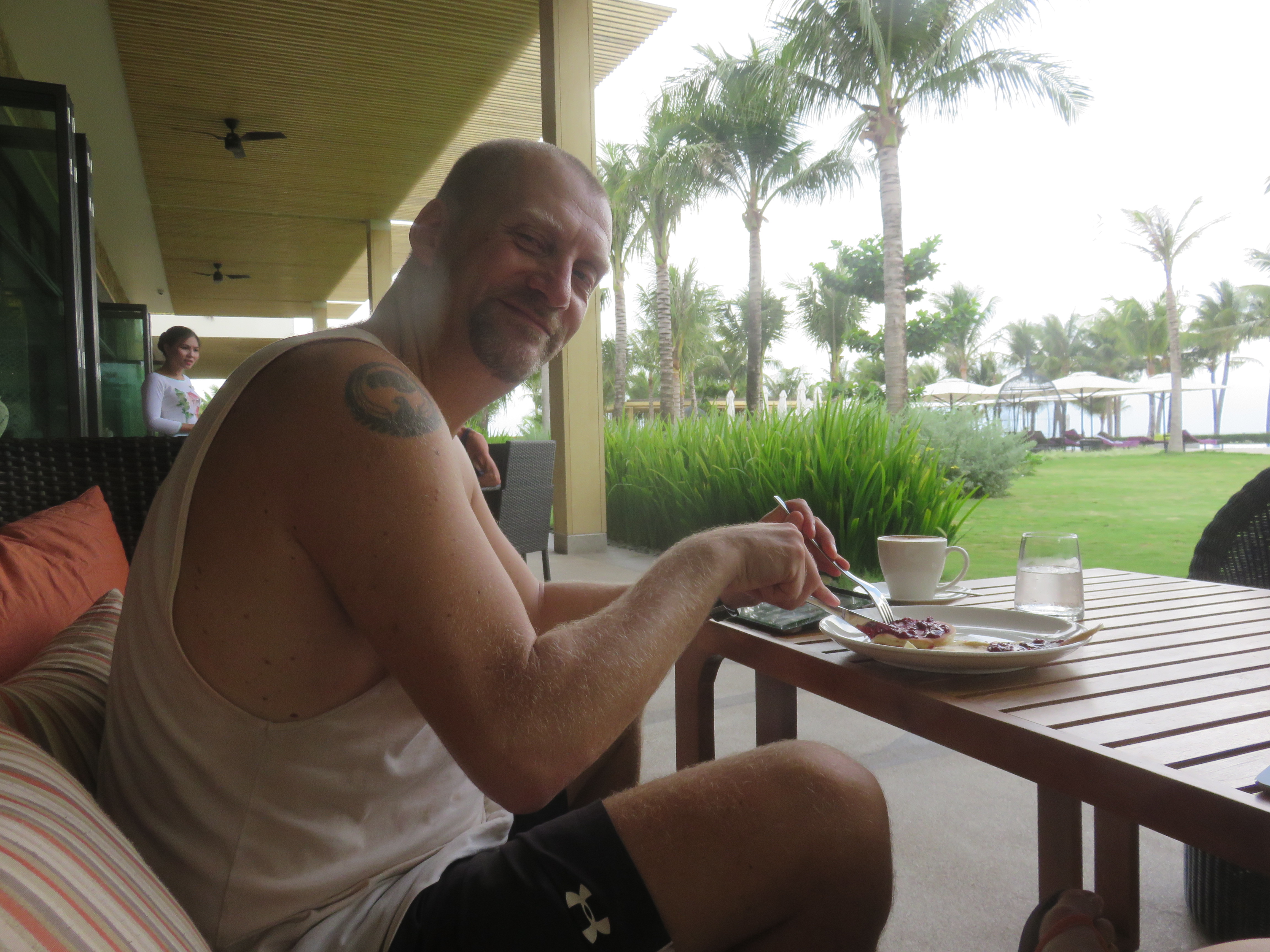 When it lightens up for a moment we dive outside and hail a cab. Safely back at the hotel we continue our day with reading, watching videos and relaxing until dinner. The Indian food we had the other day here at the resort was so good we decided to have more. Katja moved over to Lamb Vindaloo, I continue my everlasting line if chicken Tikka Masala. Why change a winning formula?