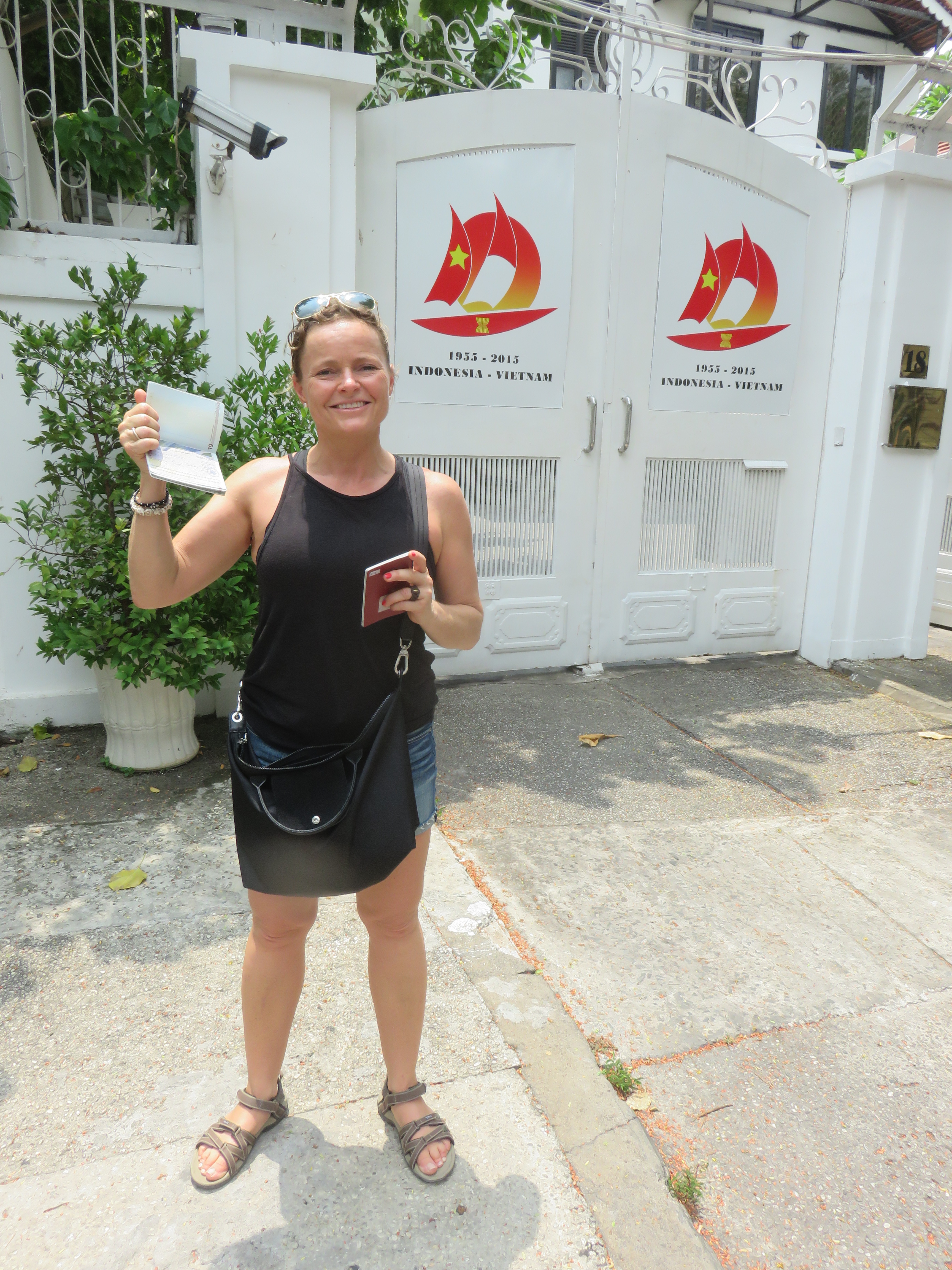 Next stop, just a short walk away, is the Indonesian embassy. We’re to pick up the passports, but did we bring our receipt? Just like with the Thai embassy in Hanoi we figure our nice smiles will get us what we want. At the counter the guy smiles and takes out our passports and ask for the receipt. When we tell him it’s back at the hotel he’s not all that happy, but hey we smile. Then there’s a question whether or not I have different pictures. Turns out they’re not overly happy with me being in a tank top either. We say, as true us, that no I have not. With strong recommendation to have a t-shirt on next time, and a promise to tear up the receipt, we get the passports. Wuhu!
