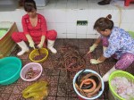 When she’s back we do a quick breakfast before heading out. We’re doing a Vietnamese cooking class today. The Ben Thanh market is our meeting spot and we meet our guide Cam and the chef Mr. Tian. The ingredients we need are all at the cooking school, but we go around the market and learn about different vegetables, fruits, herbs, fish, frogs, pork and more. The market is big and have a lot of different areas. The wet market includes pork brain, live eel and frogs. Of course you’ll find more traditional items like snapper and other known fish.
