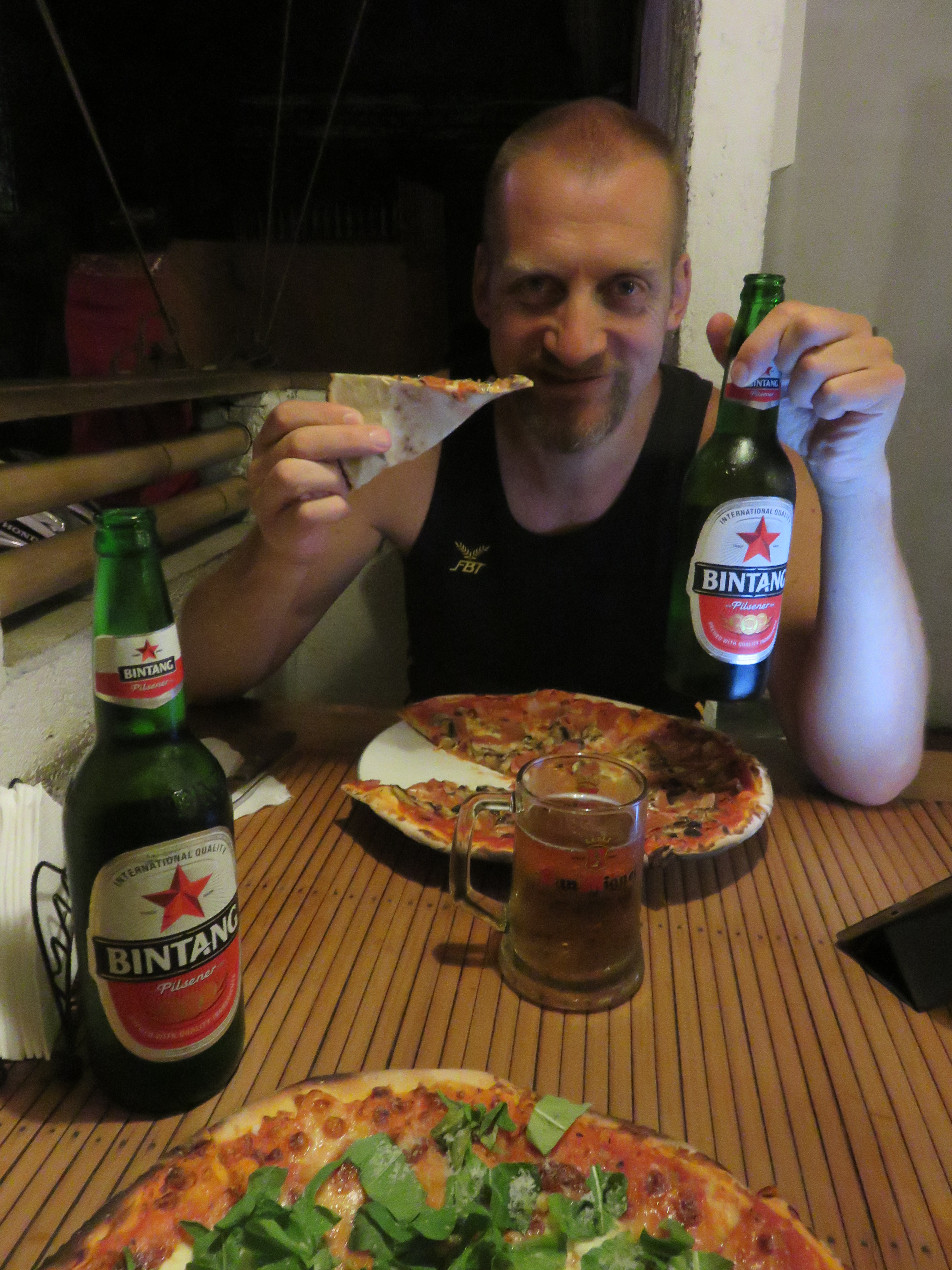 Then it’s time for dinner and we go to Mama Mia pizzeria. It’s so good so damn good. Aiaiai. I enjoy every skewed chewed bite. We down a couple of Bintang with the pizza. We’ll go non-alcohol when Katja is on the course, so this is one of the few will do here in Ubud. Got to say that Bintang is one of the best beers I’ve had here in Asia.