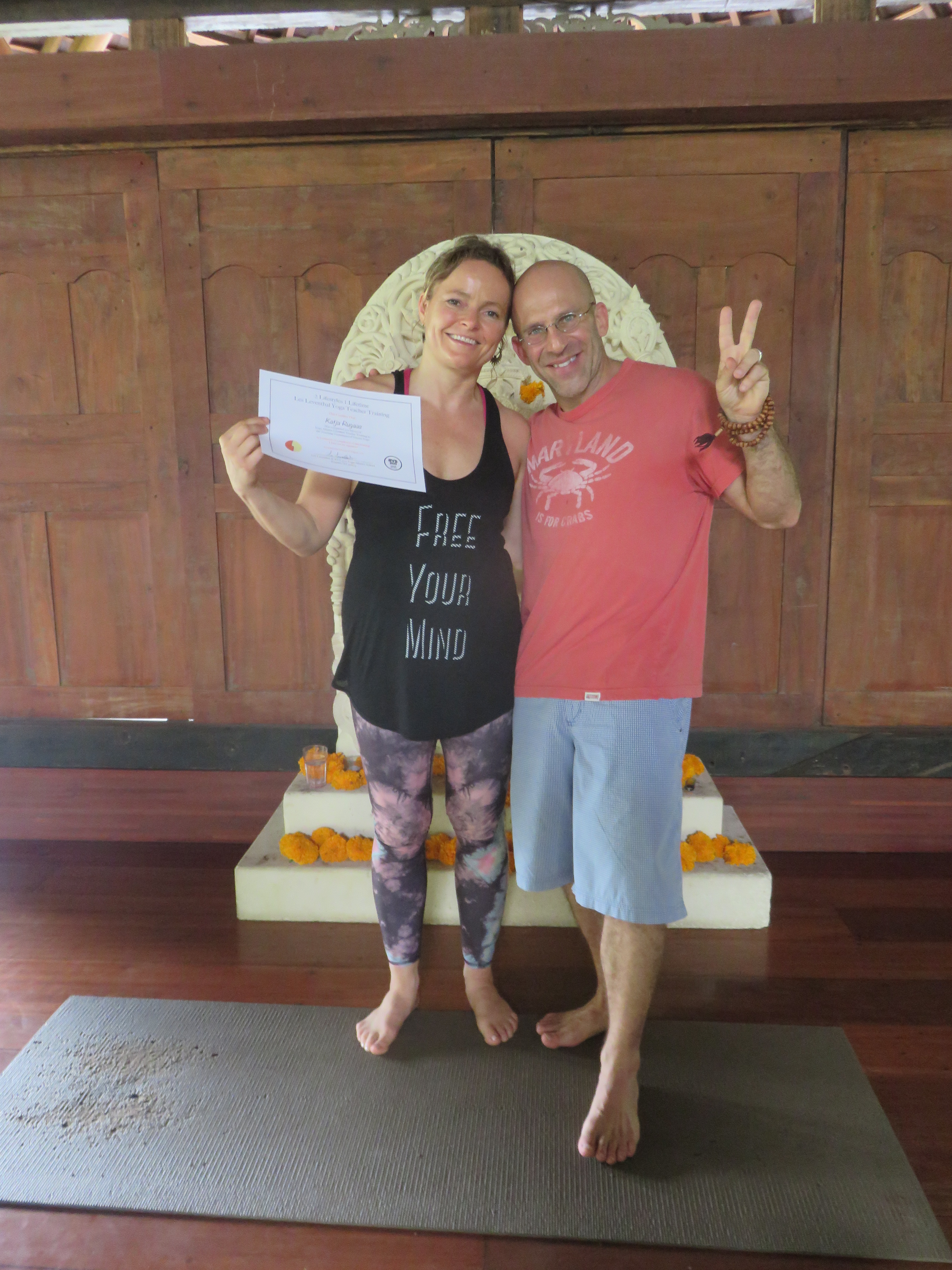 After class Katja, Emma and Kimberly got applause from the class for their assisting, and then they got their diploma. She’s now a 200 RYT. A two hundred hours Registered Yoga Teacher with Yoga Alliance. Congratulations, Snoopy!