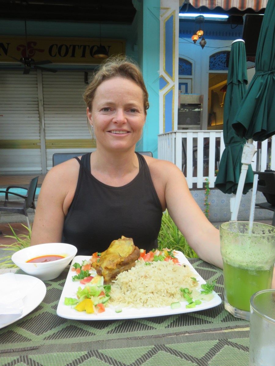 Katja enjoys lamb shank at a Mediteranian restaurant