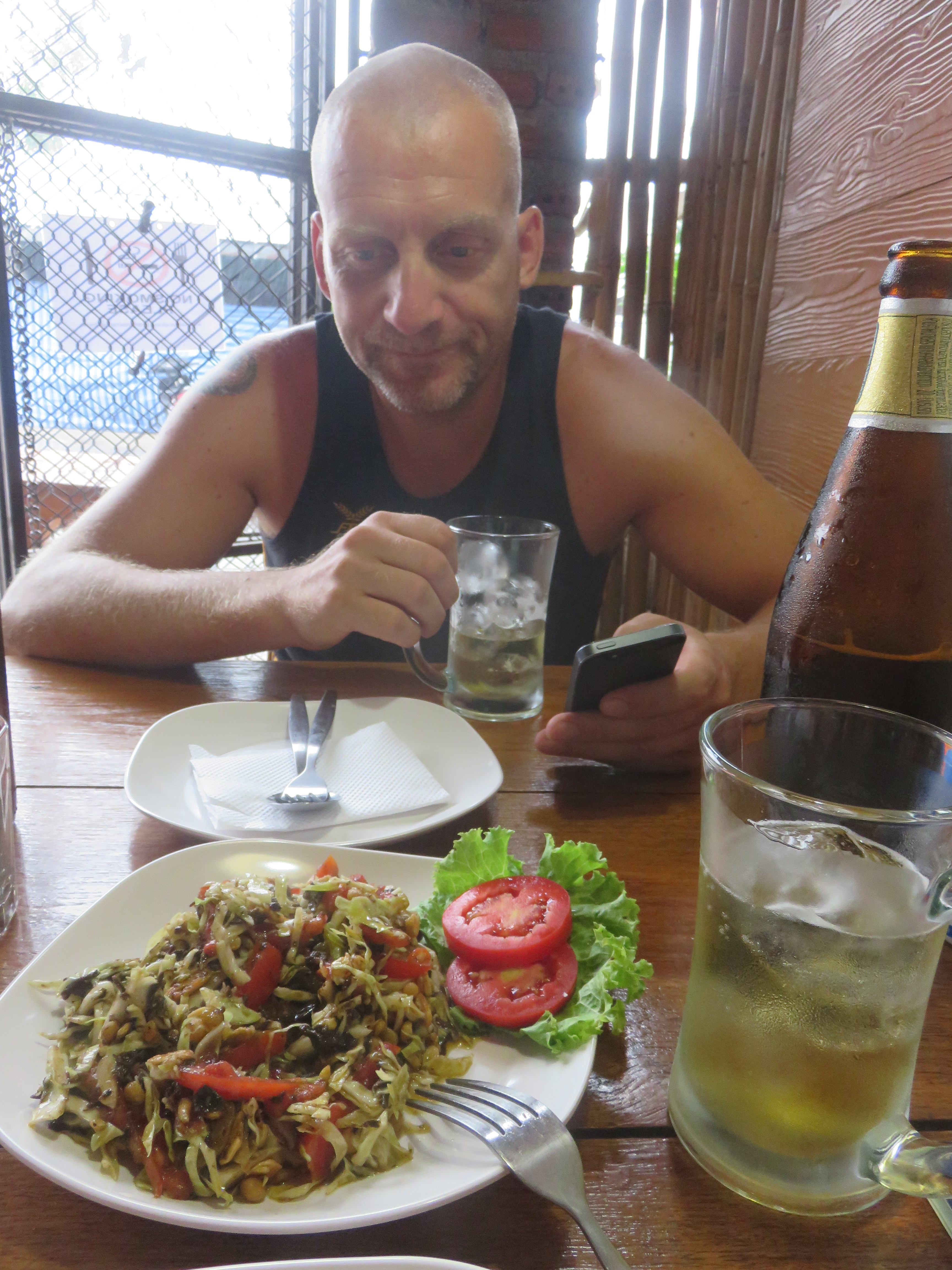 Beer with ice and Spicy green tea salad