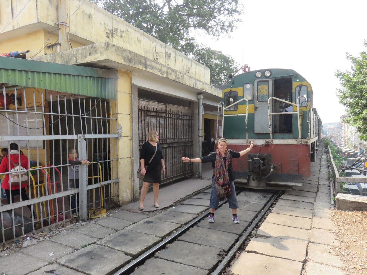 Crossing the railroad to get to the bridge.